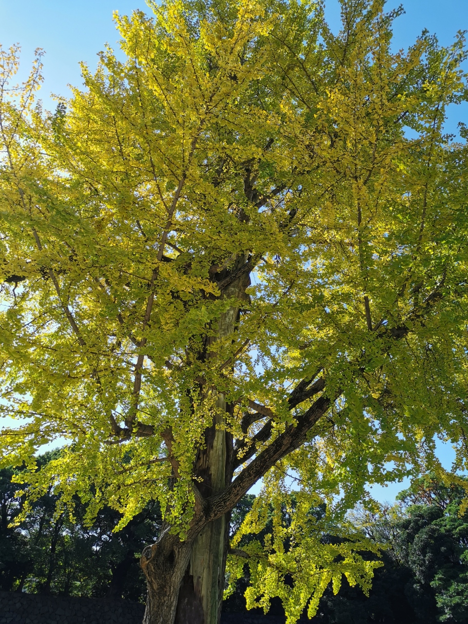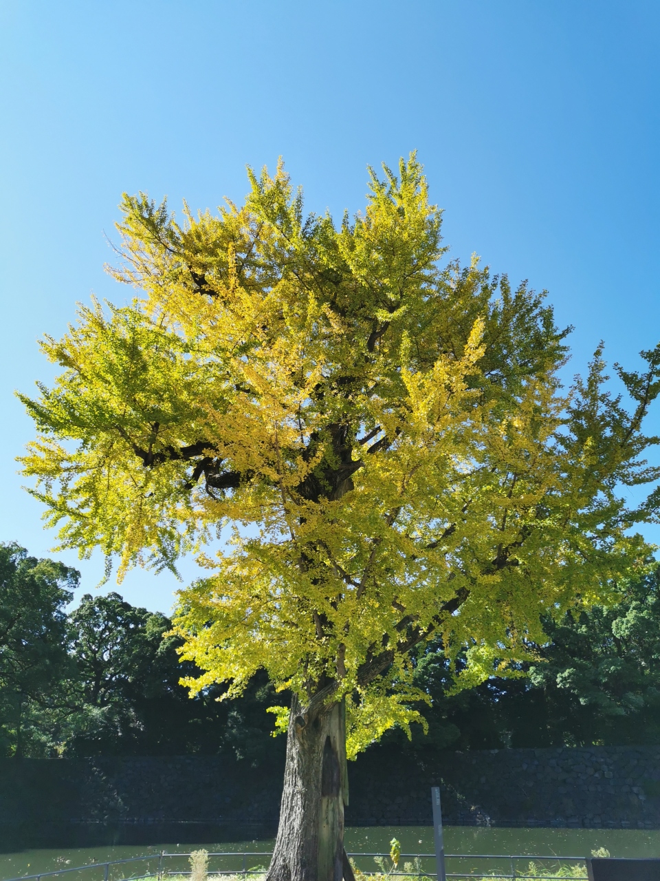 東京散歩で皇居東御苑へ。皇居東御苑内は江戸城の本丸・二の丸・三の丸の一部が公園となっているものです。大手門から江戸城跡である内堀沿いに10分ほど歩くと大手濠緑地があります。地下鉄駅の出口すぐです。三角形の公園。目の前はお堀。見事に色づいた震災いちょうと和気清麻呂の銅像がたっています。砂利引きで少し歩きにくいですが眺めはとても良いです。
