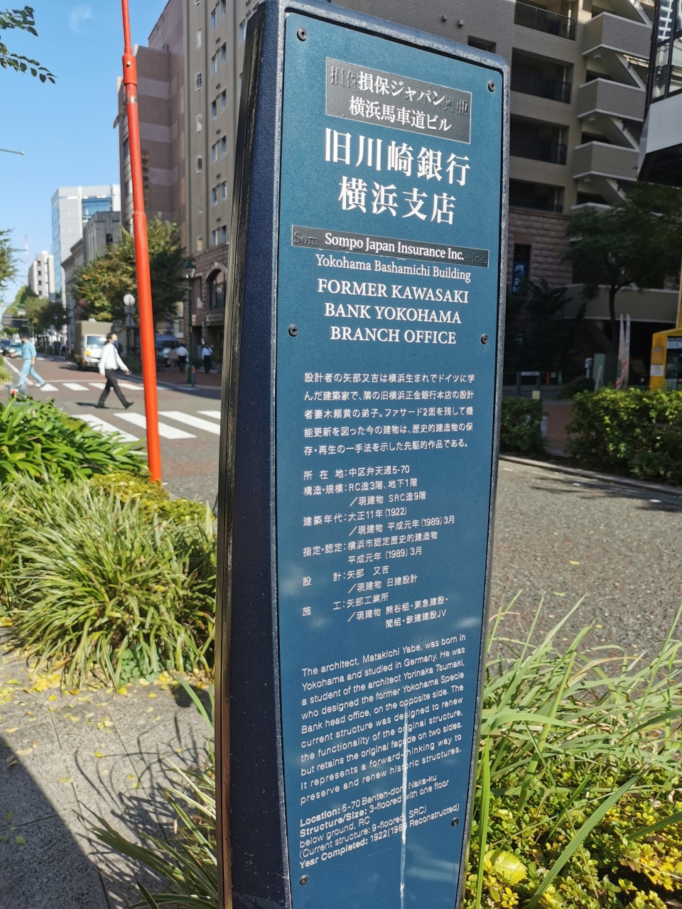 横浜散歩旅です。桜木町駅を降りてからみなとみらいを散策しました。汽車道を歩いて運河パークから万国橋を渡って関内方向へ。横浜の旧い建物を散策していきます。横浜は建物単位に案内看板があってとてもわかりやすいです。損保ジャパン日本興亜馬車道ビルは神奈川県立歴史博物館の真裏にあります。元は大正11年に建築された旧川崎銀行横浜支店だそうです。
