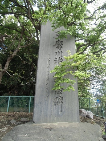 説明板等無かったので後で調べたところ、昭和11年(1936)、多摩川の治水工事の竣工を記念して建てられたものだそうです。