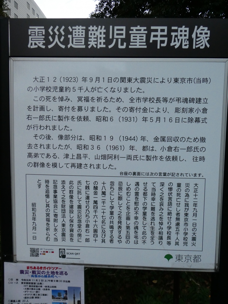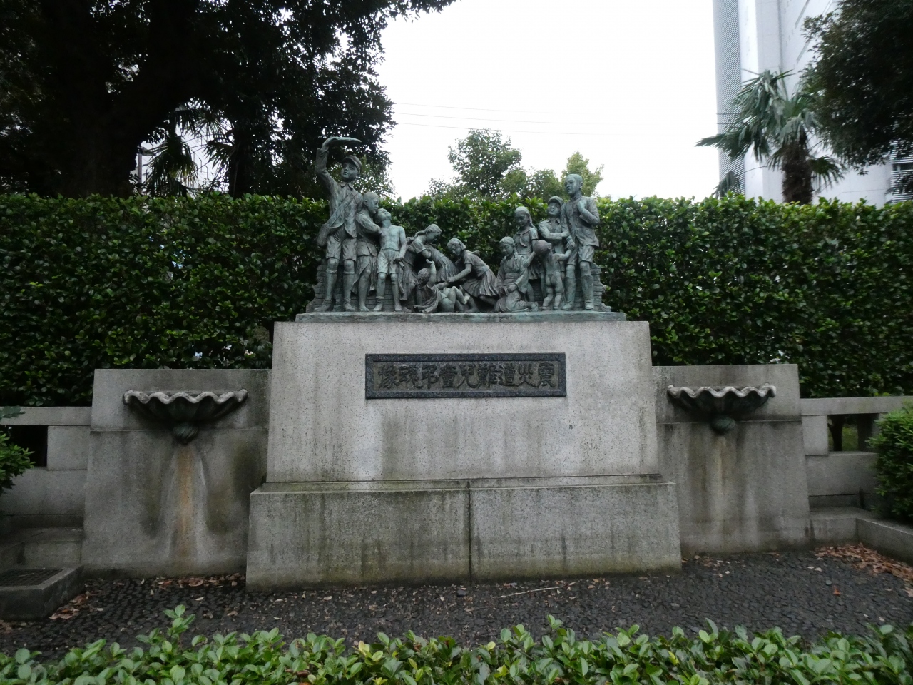 横網町公園内に設置されているこの記念像は関東大震災(大正12年・1923年)で亡くなった小学校児童約5.000人の冥福を祈る為昭和6(1931)年に当時の全市学校長等が寄付を募り作成した群像彫刻です。