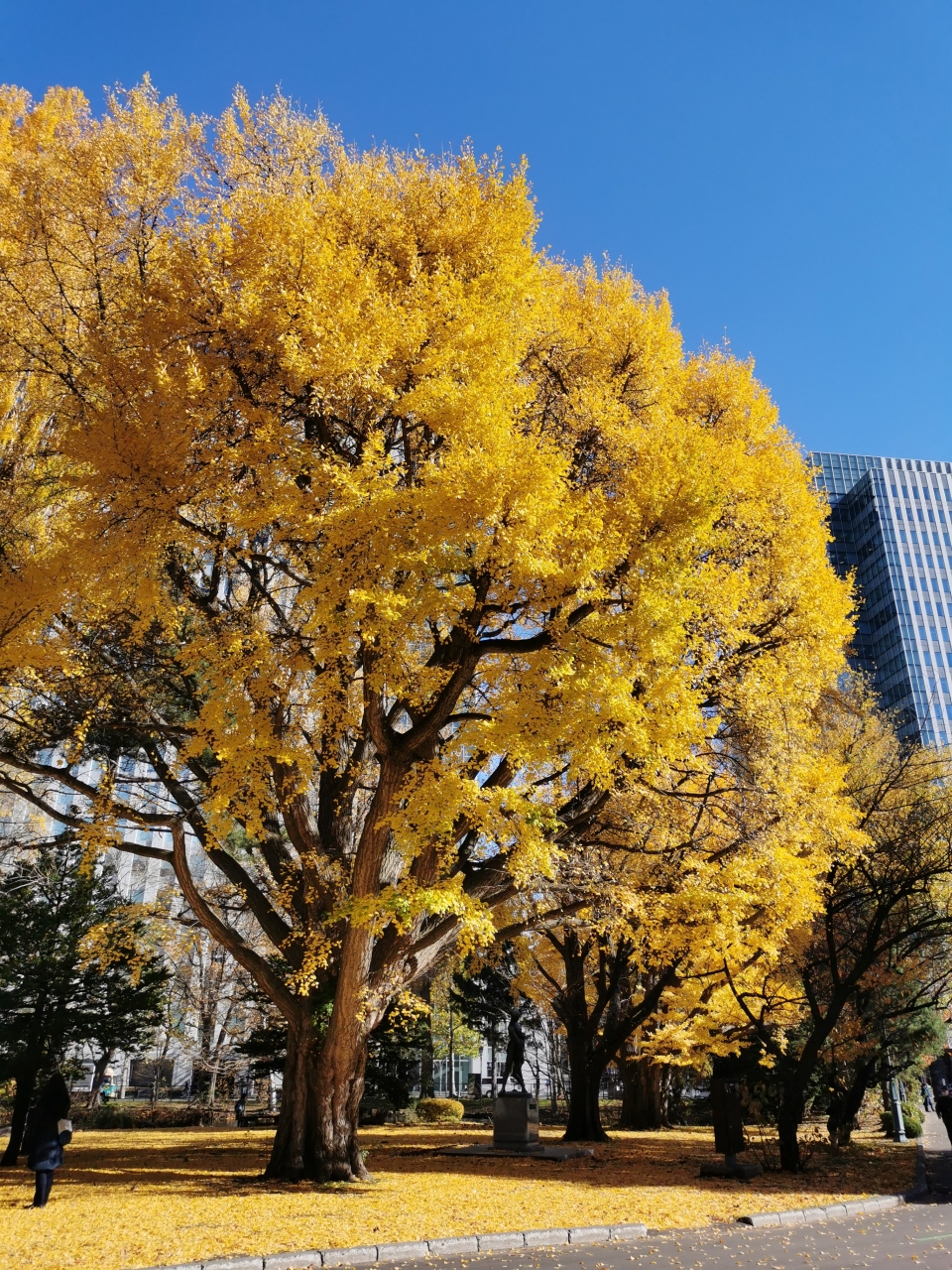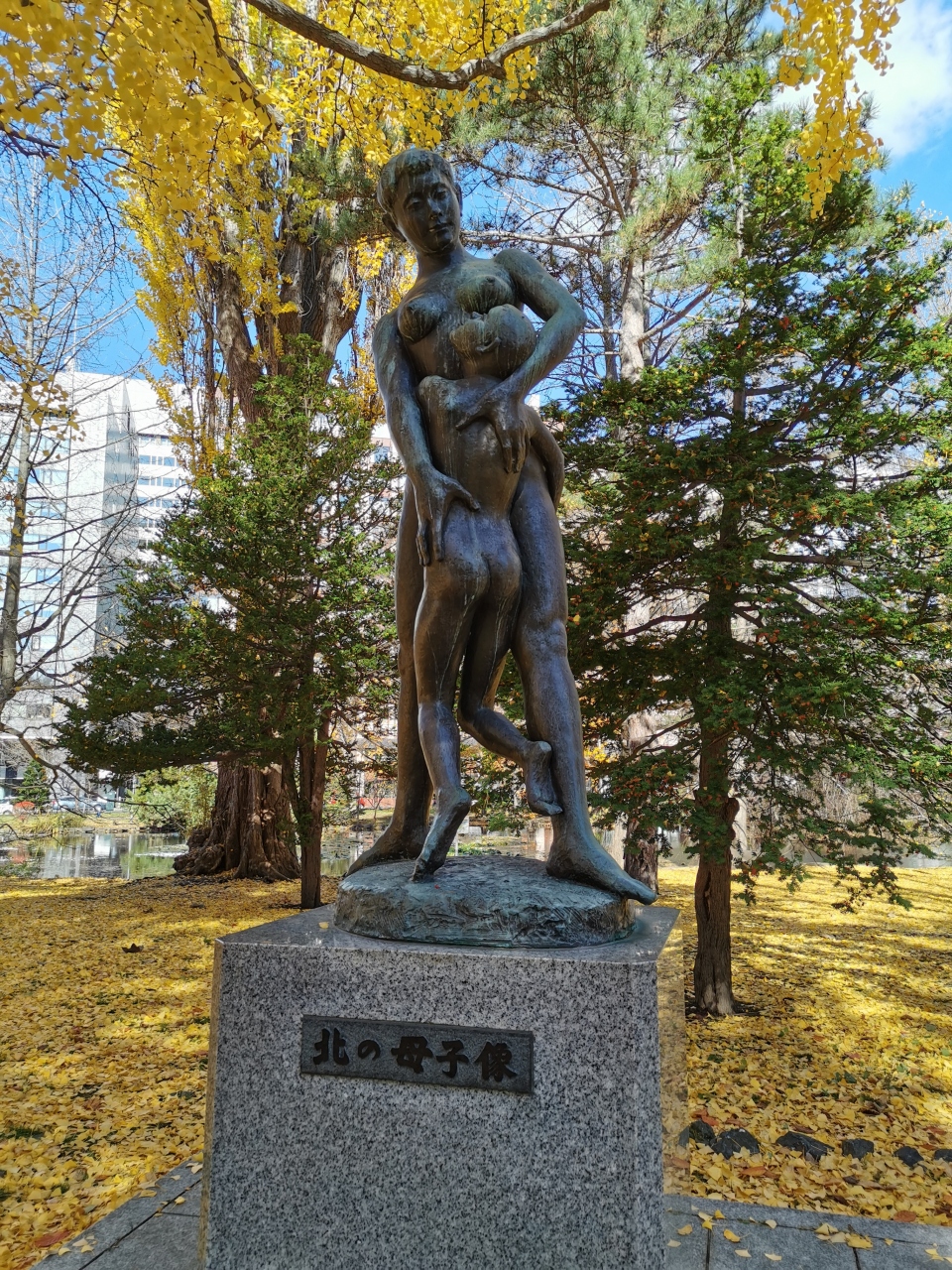 北海道一人旅。札幌と小樽を散歩旅です。中島公園と大通公園を散歩・散歩後、札幌駅方向に地上を移動しました。北海道庁旧本庁舎の赤レンガ庁舎を見に行きました。工事中で全景が見られないのが残念でした。庁舎前は庭園になっていてイチョウが真っ黄色でとても綺麗でした。「北の母子像」は、前庭内にありました。美術的な感覚がないのでなんとも言えませんが、札幌の風景にあっているような気がします。