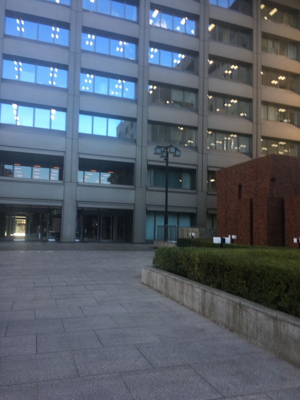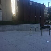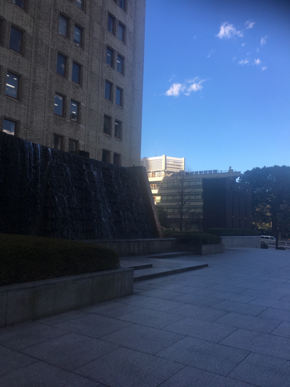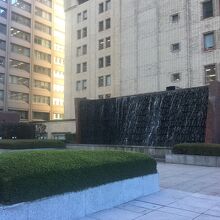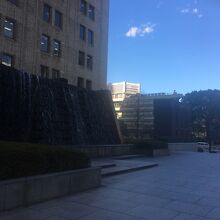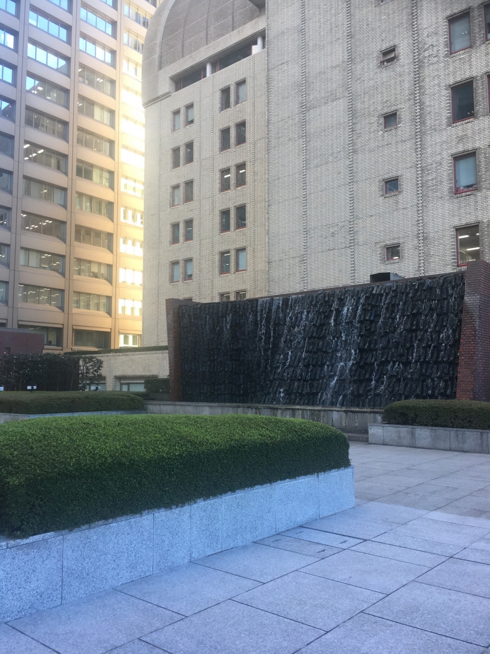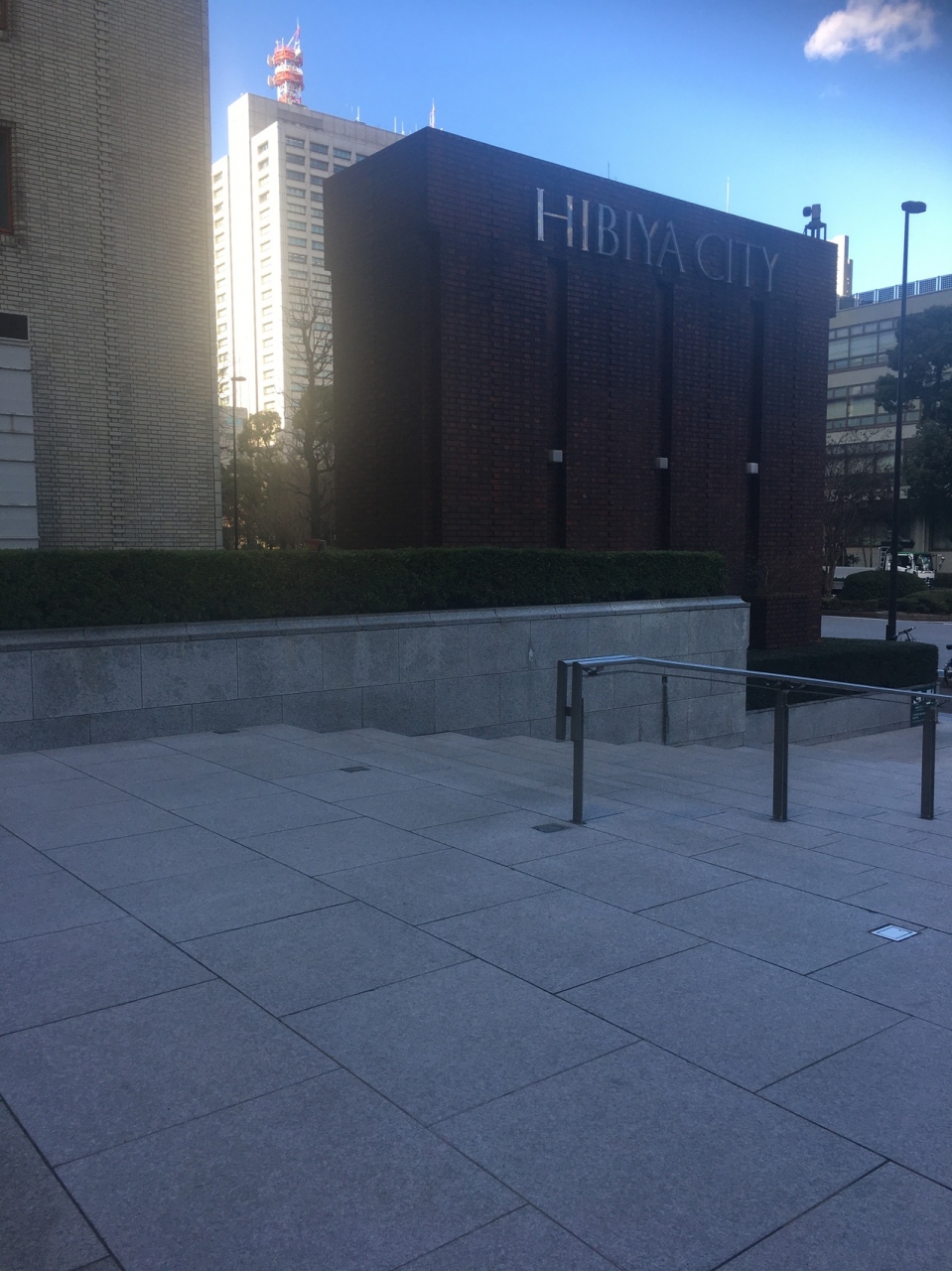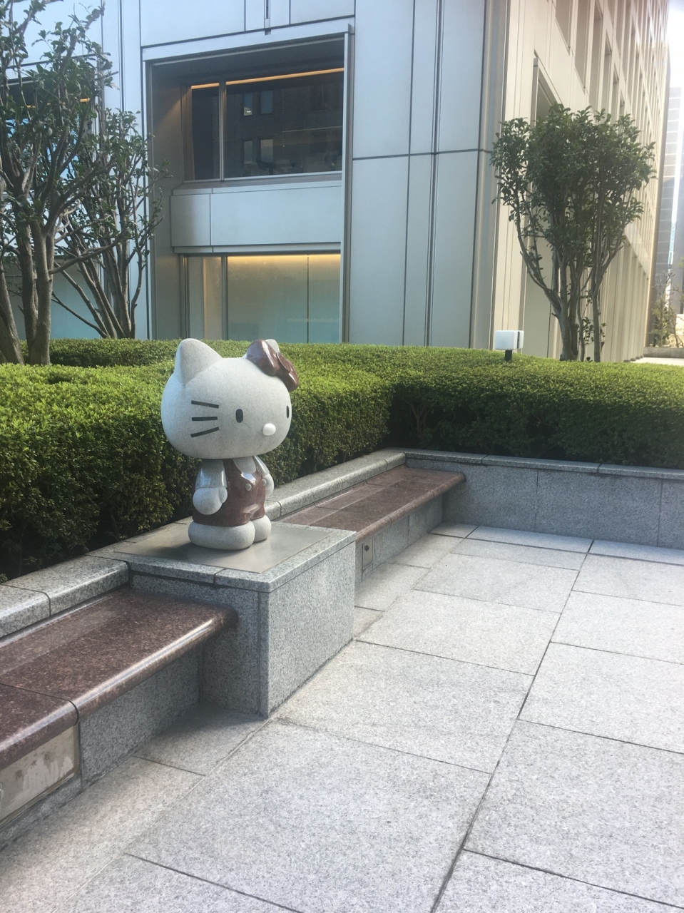 日比谷公園側の裏から行くと噴水があってビルに囲まれた通路のようなものがあり、椅子もあり休んでいる人がいました。彫刻のようなモニュメントがあって美術館のようでした。キティの人形も展示してありました。少し進むと広場が地下にあります。