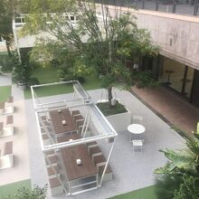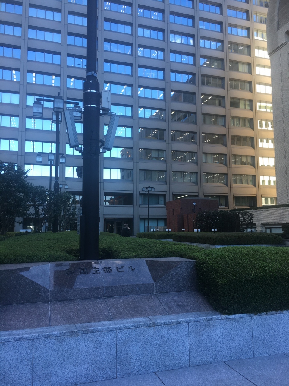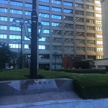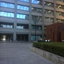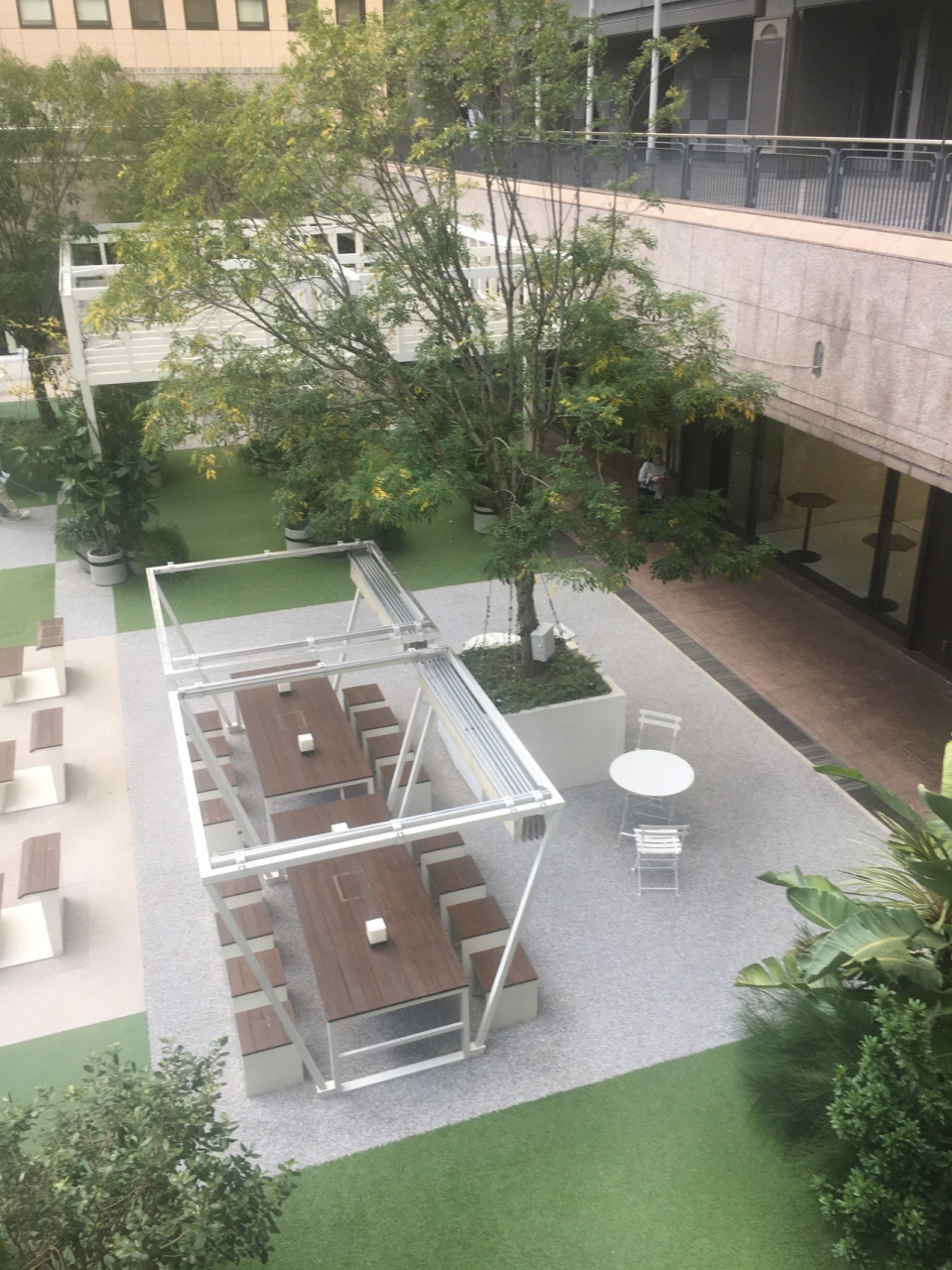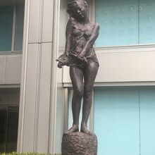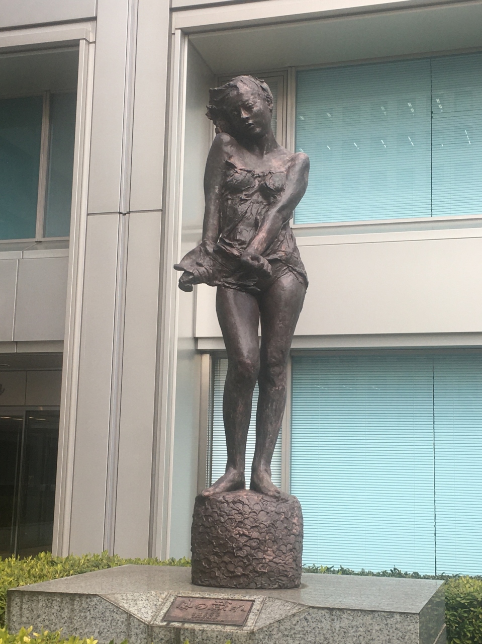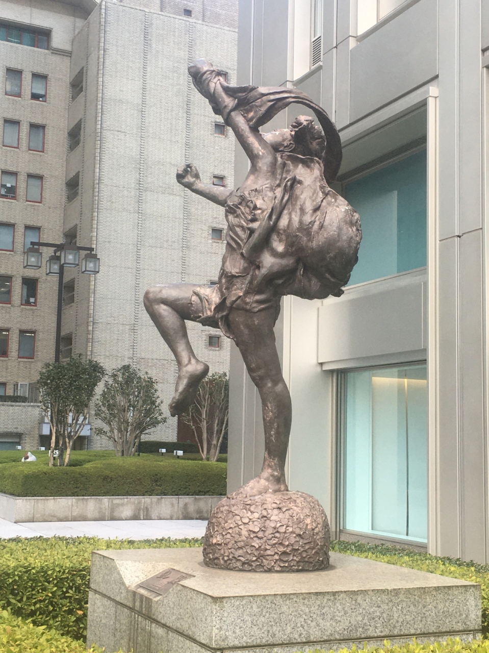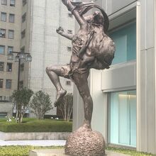 日比谷公園側の裏から行くと噴水があってビルに囲まれた通路のようなものがあり、椅子もあり休んでいる人がいました。彫刻のようなモニュメントがあって美術館のようでした。キティの人形も展示してありました。少し進むと広場が地下にあります。
