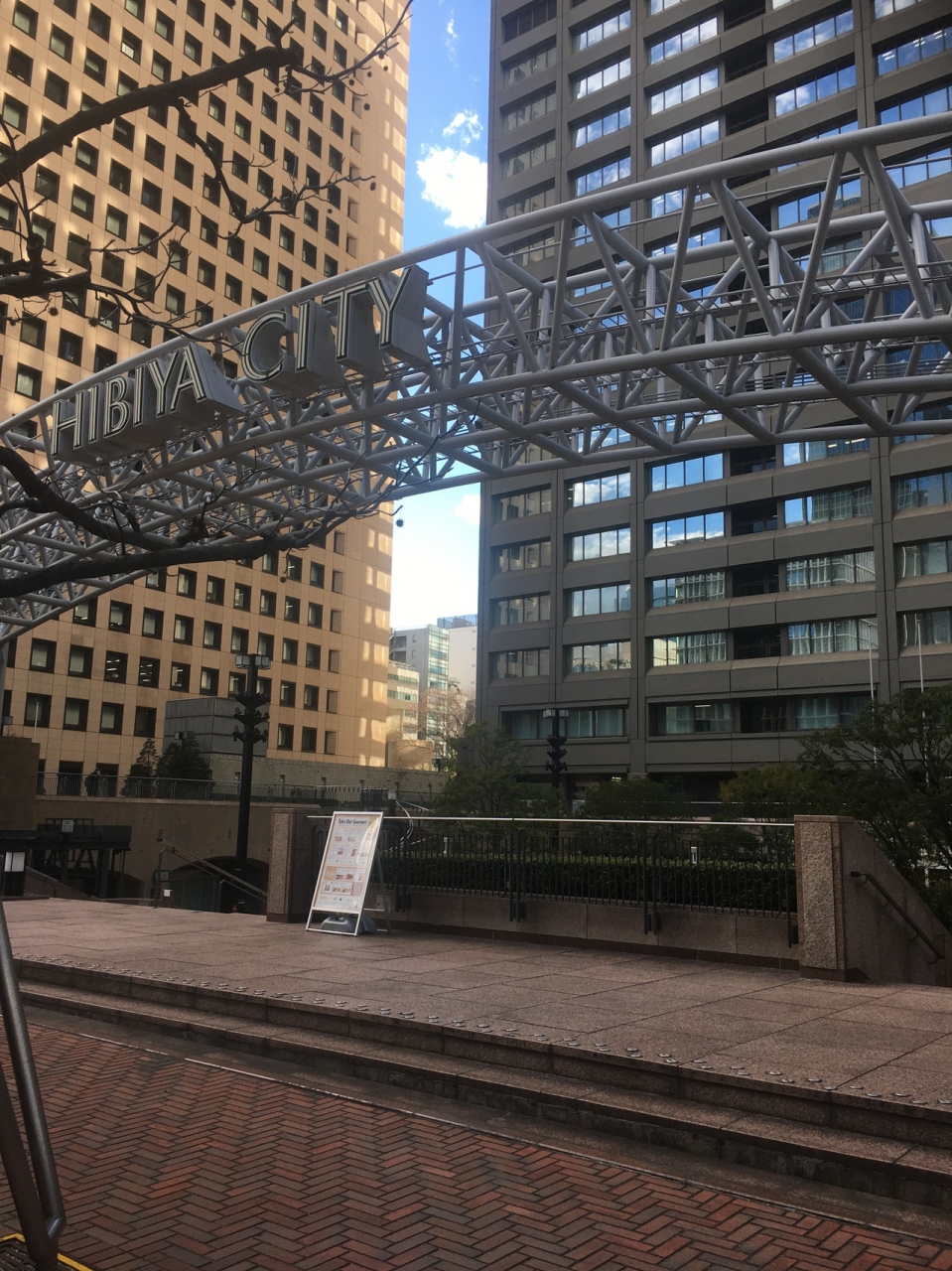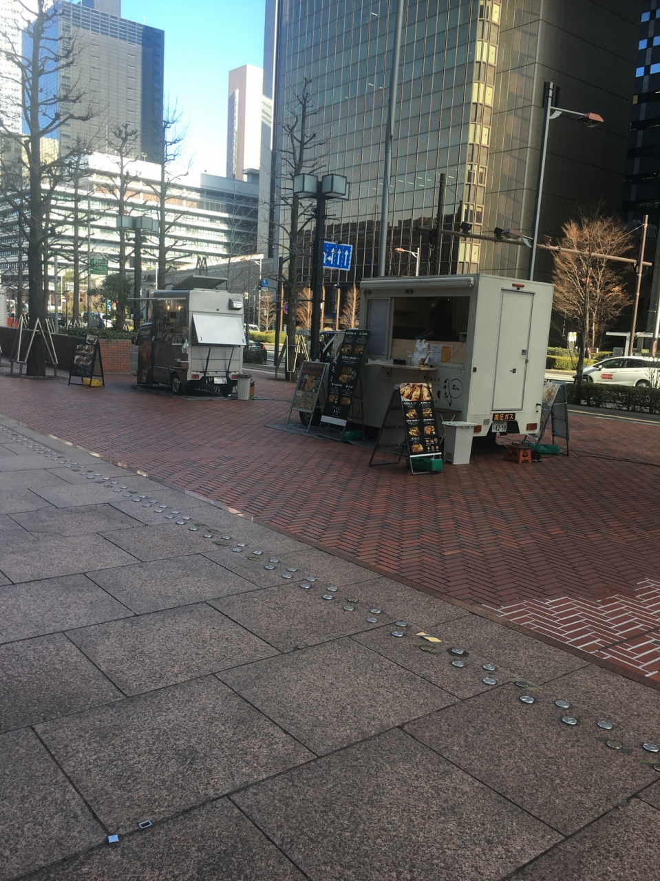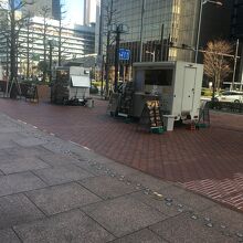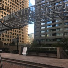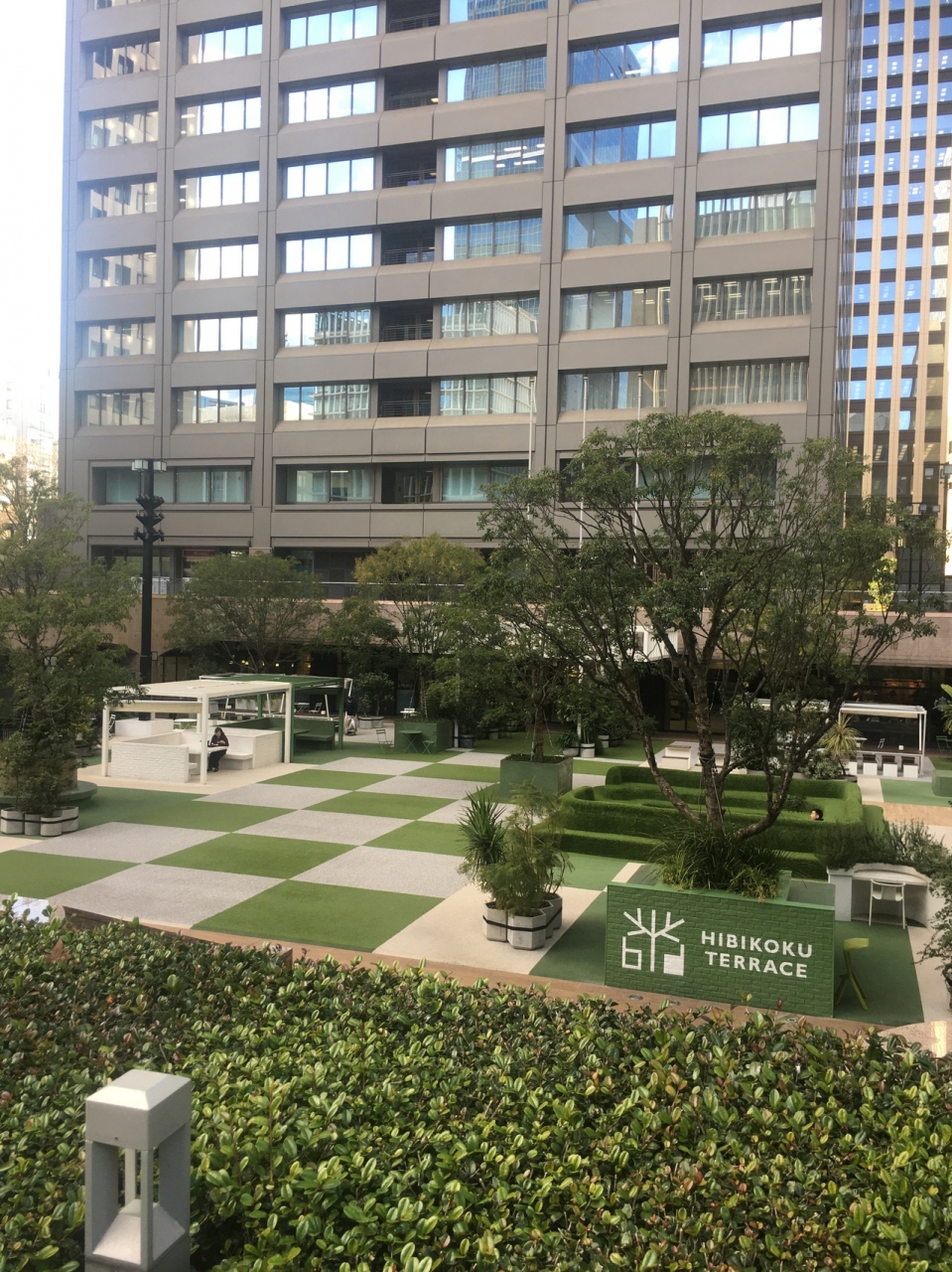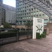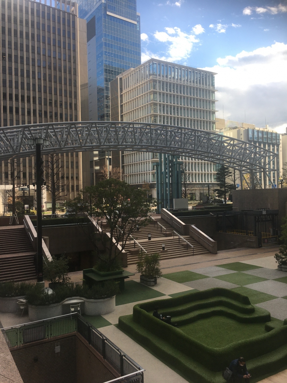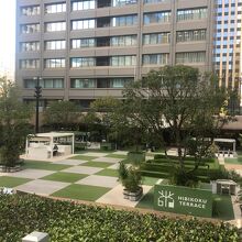 ビルに挟まれたところにあって地下にありますが、吹き抜けとなっているため太陽の光が当たる場所で人工の芝生になっていて、椅子、テーブルがいくつか配置しあり寛げる場所で、昼食時は弁当を食べている人が等多かったです。
