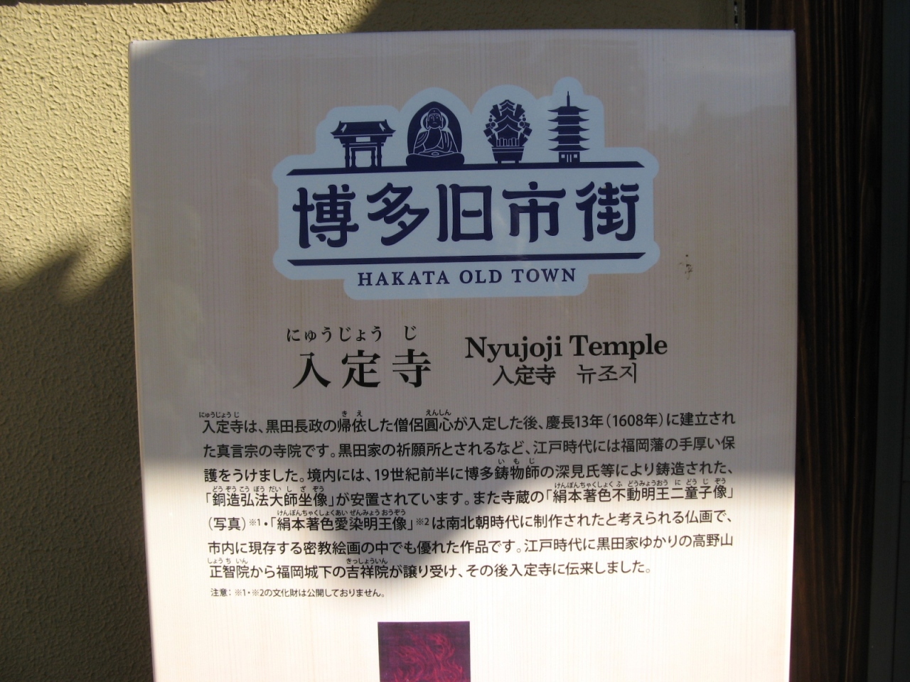 小さな山門の上の方に「入定寺」と書かれた小さな表札を見つけるまで最初はお寺かどうかも分かりませんでした。現地にある説明板によると1608年に創建された真言宗のお寺さんで黒田家の祈願所に指定されていたそうです。地味で小さなお寺さんで見所は境内にある弘法大師坐像くらいです。