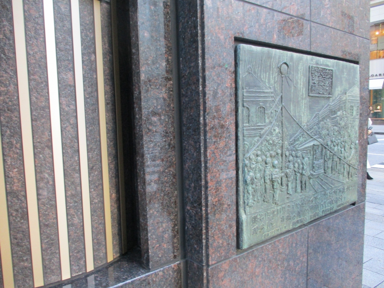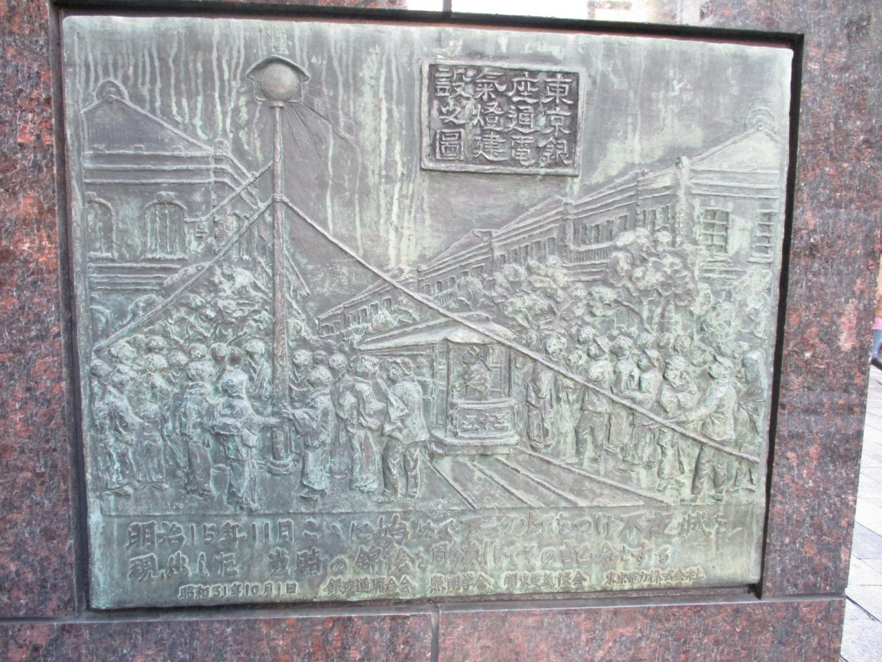 銀座の中央通りにあるカルティエのビルの角に青銅色のレリーフのプレートがはめこまれています。大勢の人が電気の灯柱の周りに集まっています。ガス灯やランプの時代に、宣伝のためにこの辺りに2,000燭光のアーク灯が点灯されたそうです。1882年。さぞ斬新だったと思います。