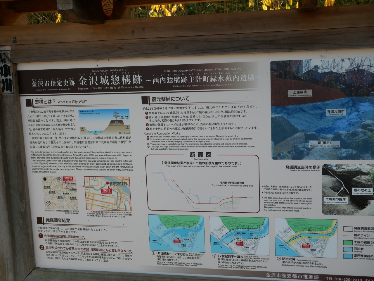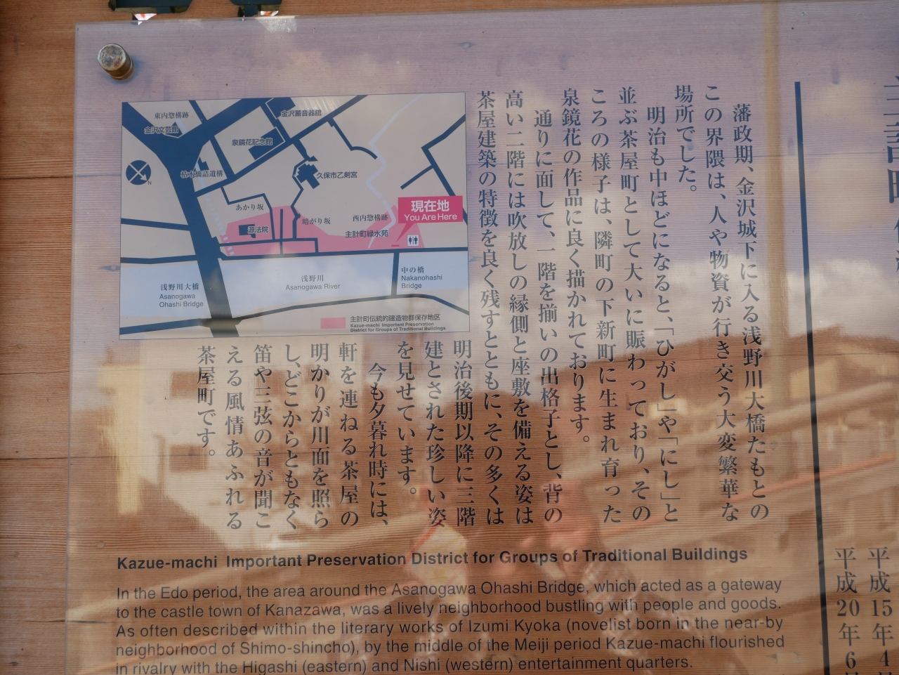 中の橋を渡って、主計町茶屋街に行こうとしたら、公園みたいなスポットがあり、何だろうと見てみたらこの惣構跡でした、惣構とは町を守るために、堀や土を盛った土手で囲んだ防御施設のことだそうで、詳しく説明が書いてありました。