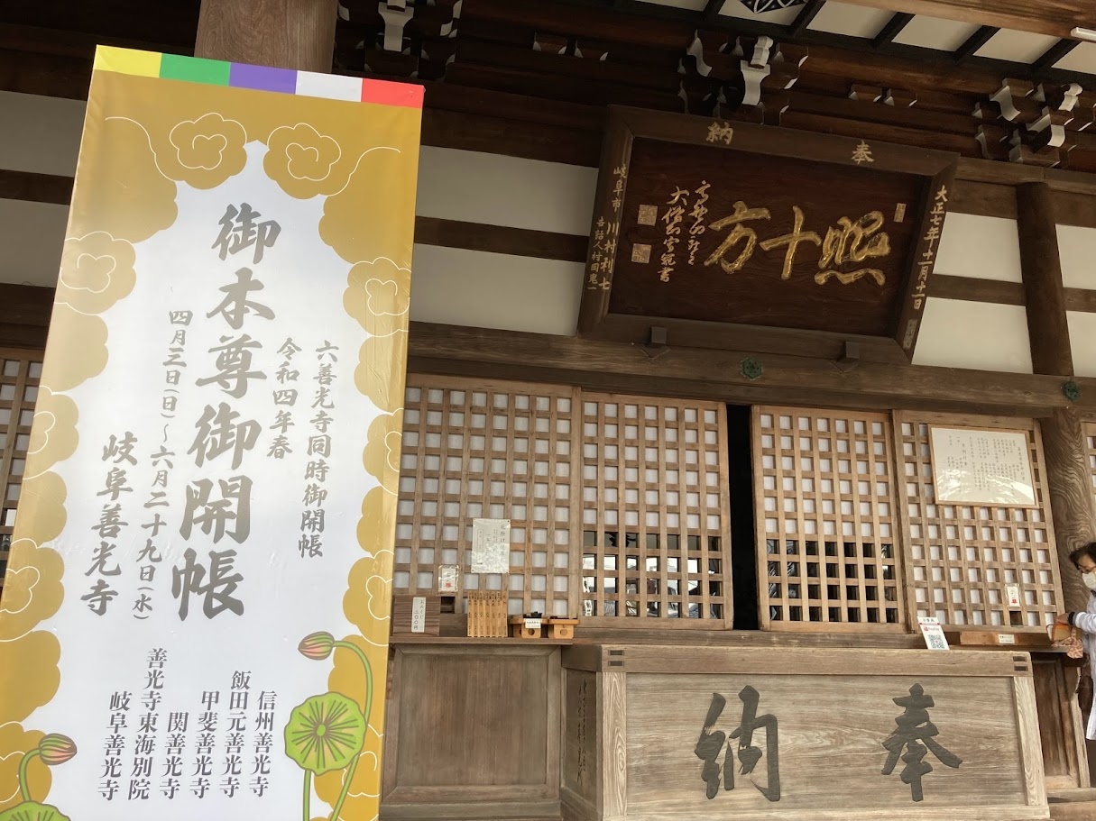 信州善光寺の7年に一度の御開帳に合わせて、元、甲斐、祖父江、関、とここの岐阜善光寺の「六善光寺」が、令和4.4.3から88日間、同時に御開帳を行うとの看板が出ていました。
