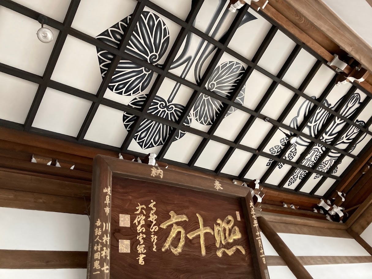 本堂入口の天井には織田家の木瓜紋、善光寺の寺紋の左離れ立ち葵、桐紋が描かれていました。