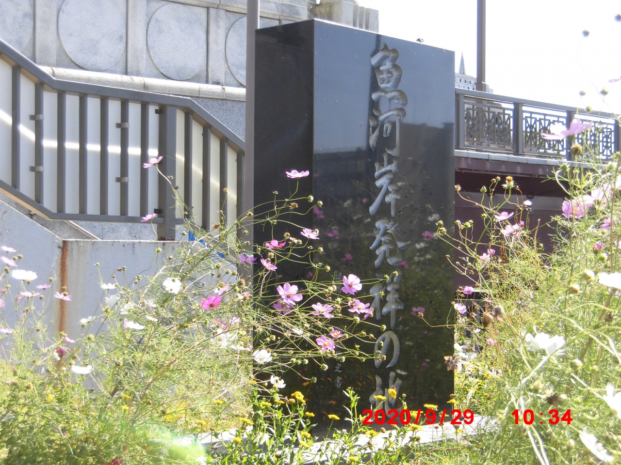 釧路市観光で立ち寄りました。幣舞(ぬさまい)橋の袂、EGG (Ever Green Garden 釧路港東港区北地区緑地)のすぐ南にあった黒い大きな碑です。幣舞橋の橋の上に出る石段の前にある高さ1.4mほどの石碑です。ここに大きな魚河岸があったのは、釧路沖が“世界の三大漁場”の一つといわれる豊かな海だったことが影響しているようです。