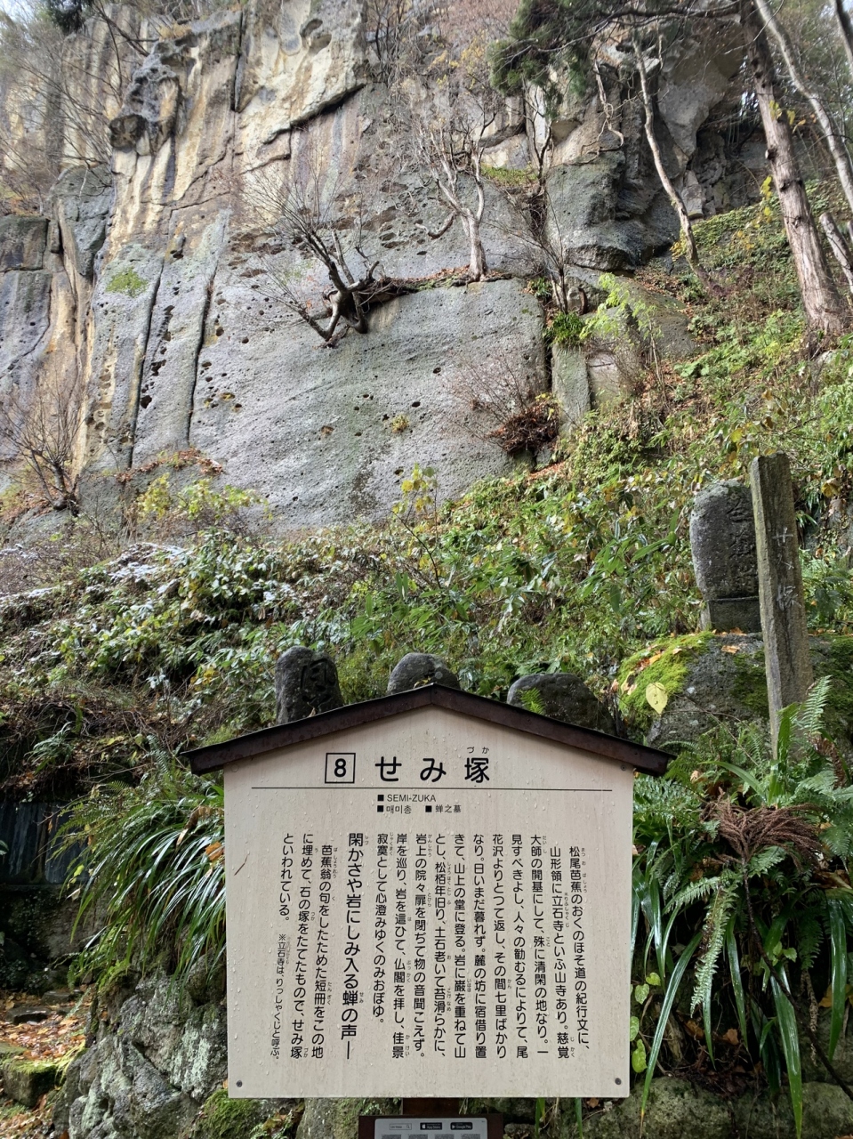 立石寺の山門から階段を登り初めて少しするとせみ塚がありました。せみ塚と書いてあるので昆虫のせみが関係あるのかと思いましたが違いました。松尾芭蕉の句をしたためた短冊をこの地に埋めて石の塚をたてたものをせみ塚と言われているそうです。