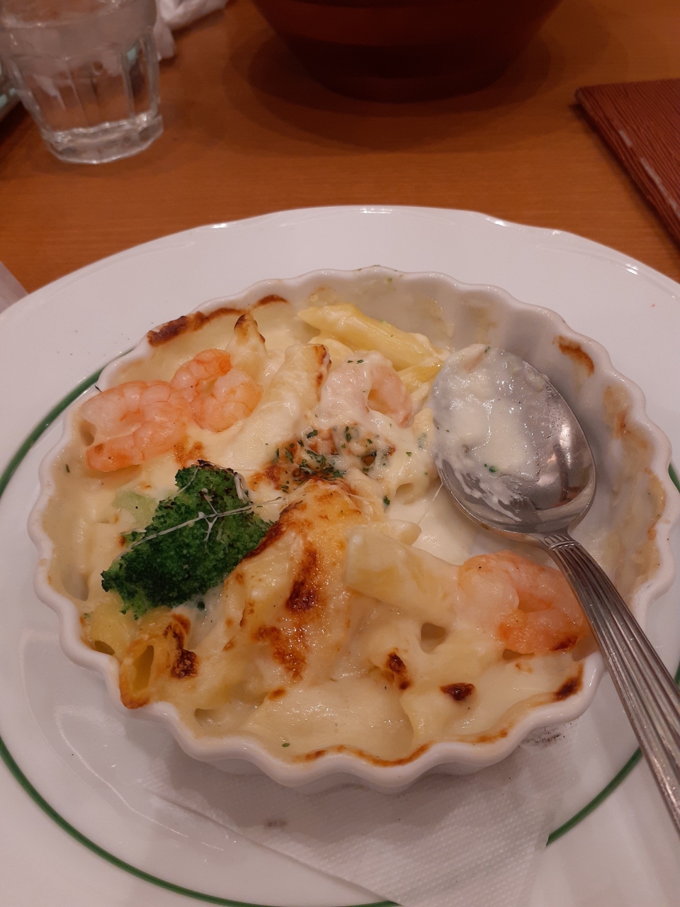 桜木町駅近くでなるべく混んでいないお店を捜しました。たいていのお店はそうですが、検温とアルコール消毒をして入りました。衝立もありましたが、なるべく隣が空くように配席してくれるようです。イタリアンで、エビグラタンとホタテのスパゲティを頼みました。どちらも程よい味加減で美味しかったです「go to eat」が使えました。
