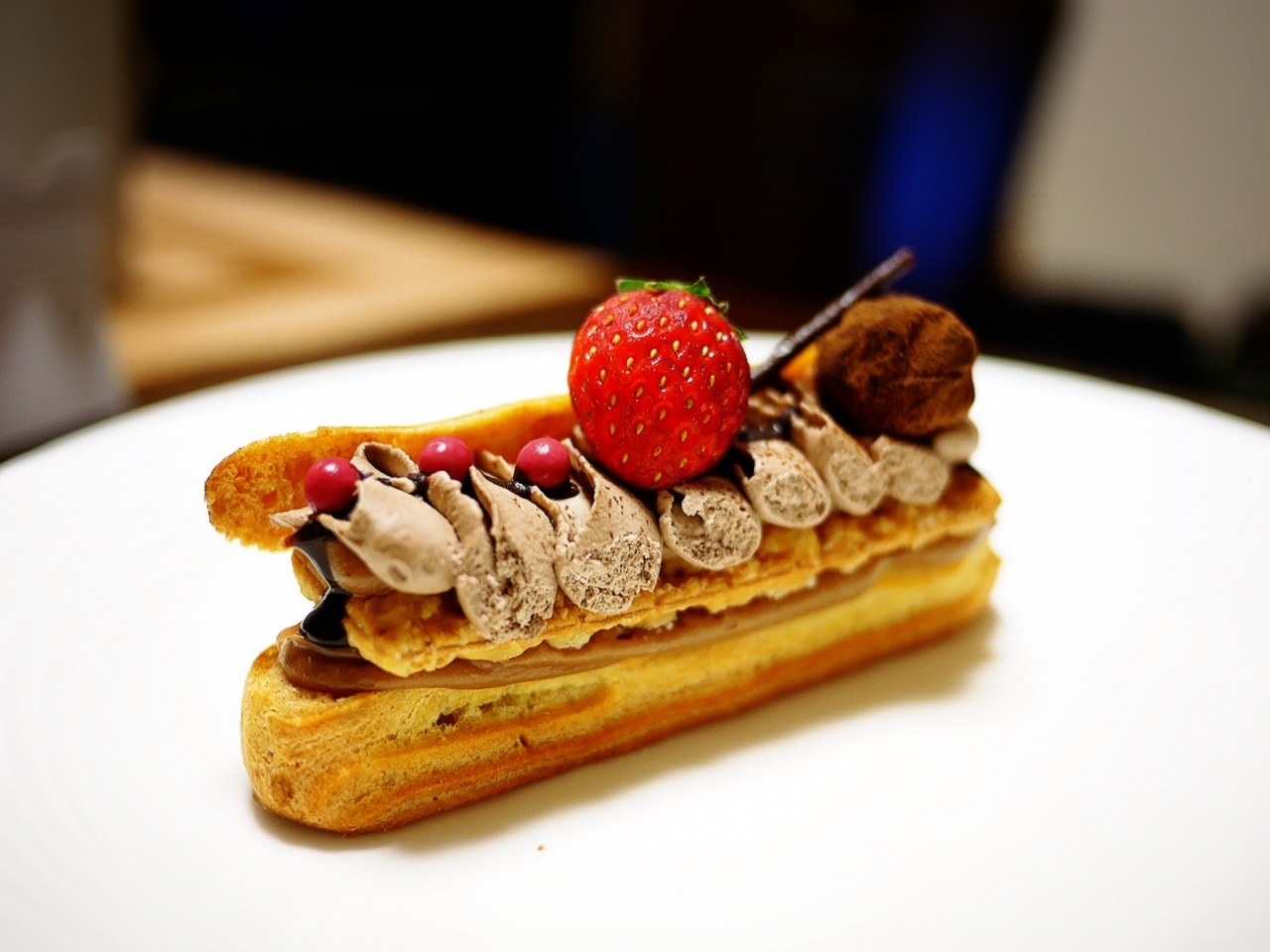 ---生チョコトリュフやシュー生地、ガナッシュ、チョコレートクリーム、カスタードクリームを重ねてデコレートした見た目も可愛いエクレアですが、重奏感はなく、味の調和は今ひとつ。