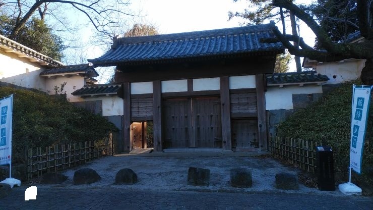 館林駅から徒歩15分ほどのところにある館林城の通用門。駅前の通りから回り込んだ場所にある。当時のものではなく復元されたもの。