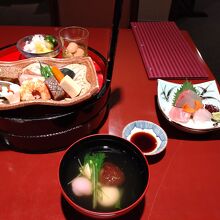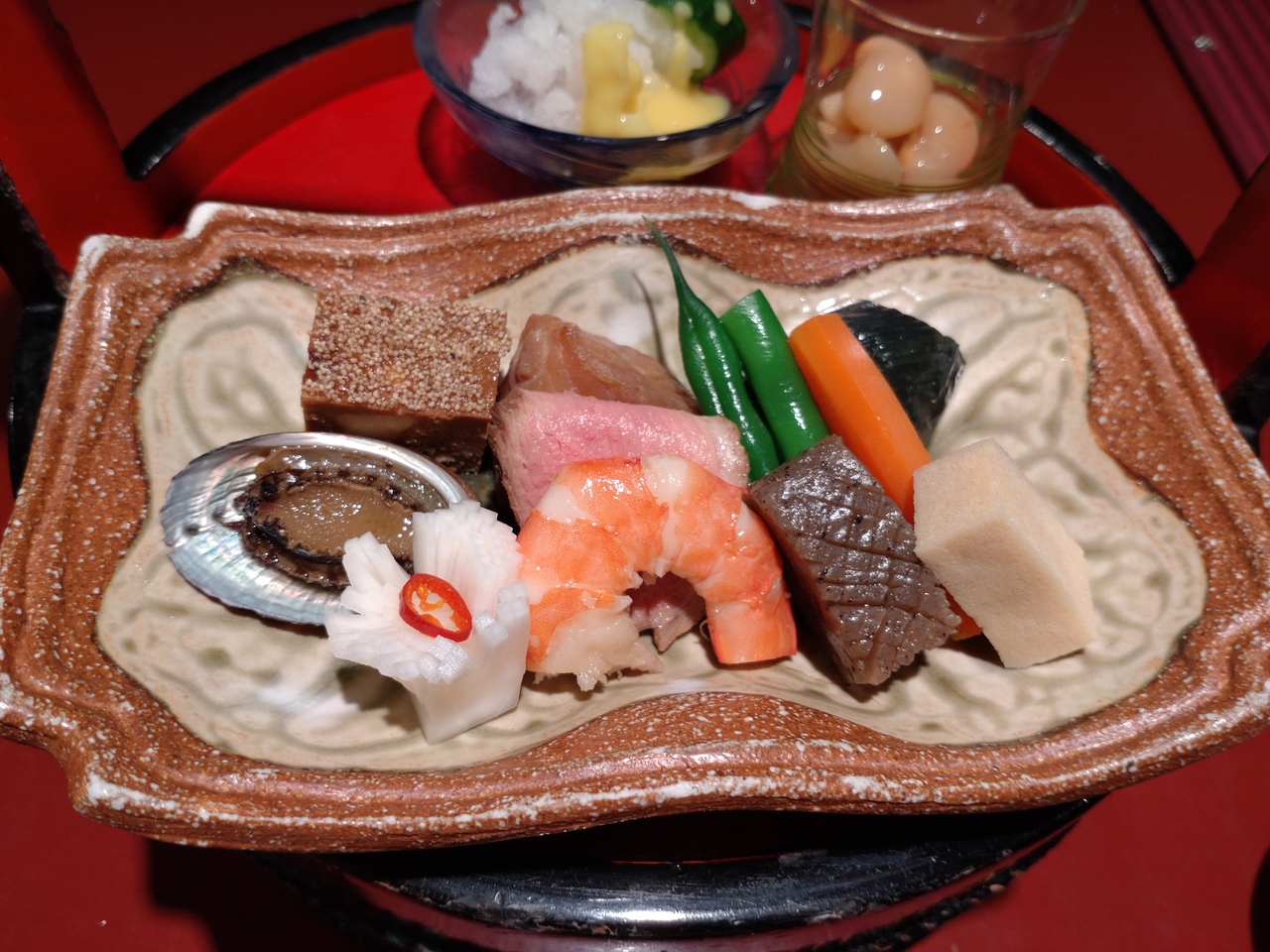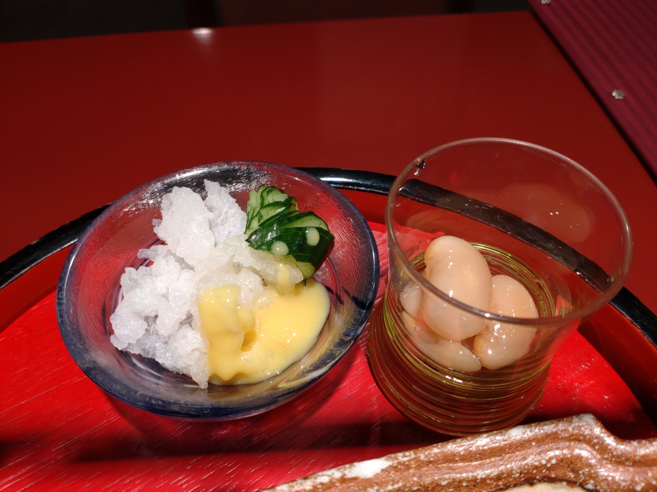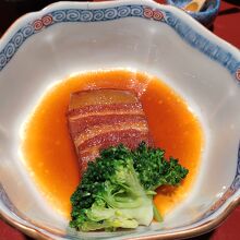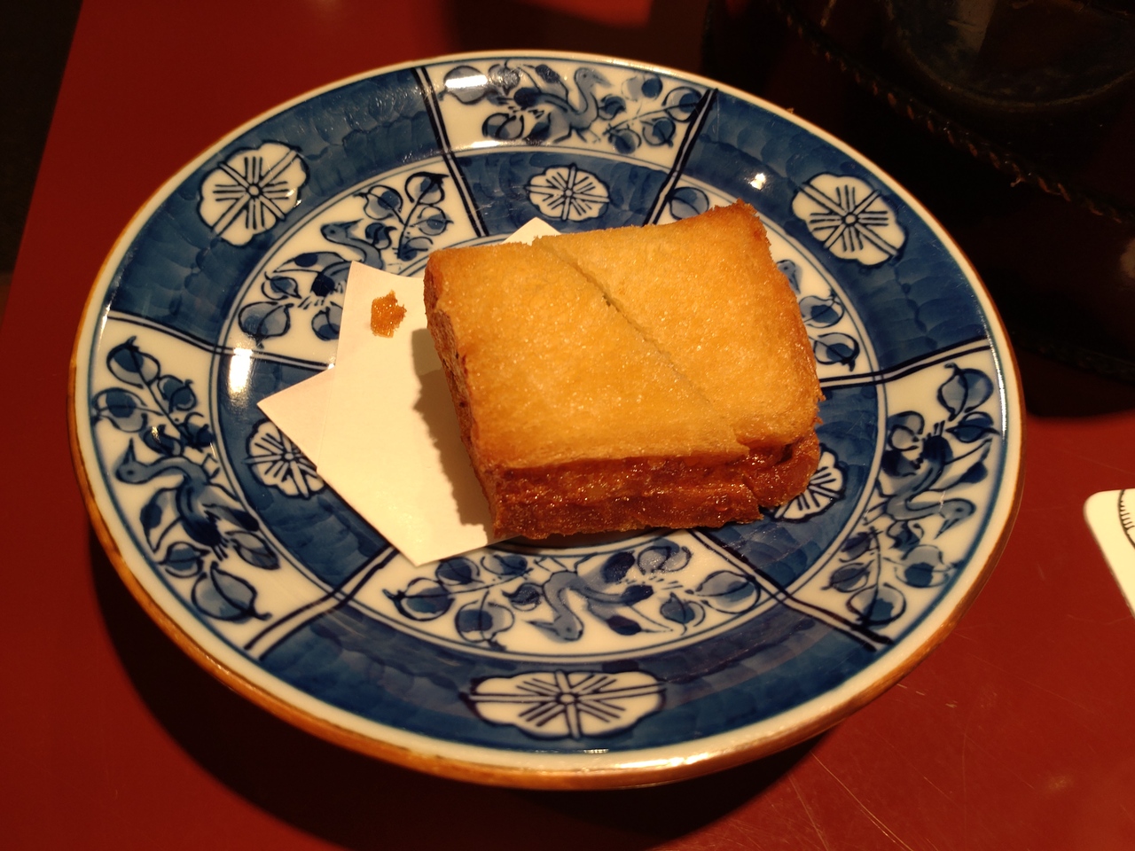 今回は、「ぶらぶら卓袱」(4300円)をオーダー。まずは、乾杯の前にいただく「おひれ」というお吸い物が出されます。鯛を使ったお吸い物で、目太鯛、丸餅、玉半片、対馬のどんこ、水菜か入った上品な一品。続いて、朱色の桶に入った料理で、いわゆる前菜。バラ煮は、十八寸豆の蜜煮で、甘い煮豆ではあるが、黒豆とは異なる甘さで、これがビールにも合う。酢の物はさらし鯨の酢味噌和え。酢味噌は酢が強すぎず、食感も楽しい。口取りの森合わせも豪華。和洋折衷なところがいかにも長崎。特に松風焼きとトコブシが美味。一つ一つ丁寧な調理。お刺身は白身が中心ですが赤身(マグロ)も。長崎といえば白身魚なので赤身を出さなくてと思いましたが味は普通。揚げ物はハトシ。エビのすり身を食パンで挟んで揚げたもは、長崎でしかでしか食べられない味。サクサク感とふんわりとしたエビのすり身の食感かたまらない。そして角煮。雲仙の豚肉を使っているとのこと。まずその甘さに驚く。さすが砂糖文化の根付いた長崎。もちろんトロトロの柔らかさ。甘いのですが、これがご飯と合う。許されるならその汁をご飯にかけたいくらい。ご飯は五島産。きゅうりの焼酎漬けとたくあんもいい味を出している。最後は水菓子と白玉と桜の塩漬けの入ったお汁粉で終わり。こし餡のお汁粉はかなり甘いが、慣れて来ると美味。