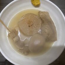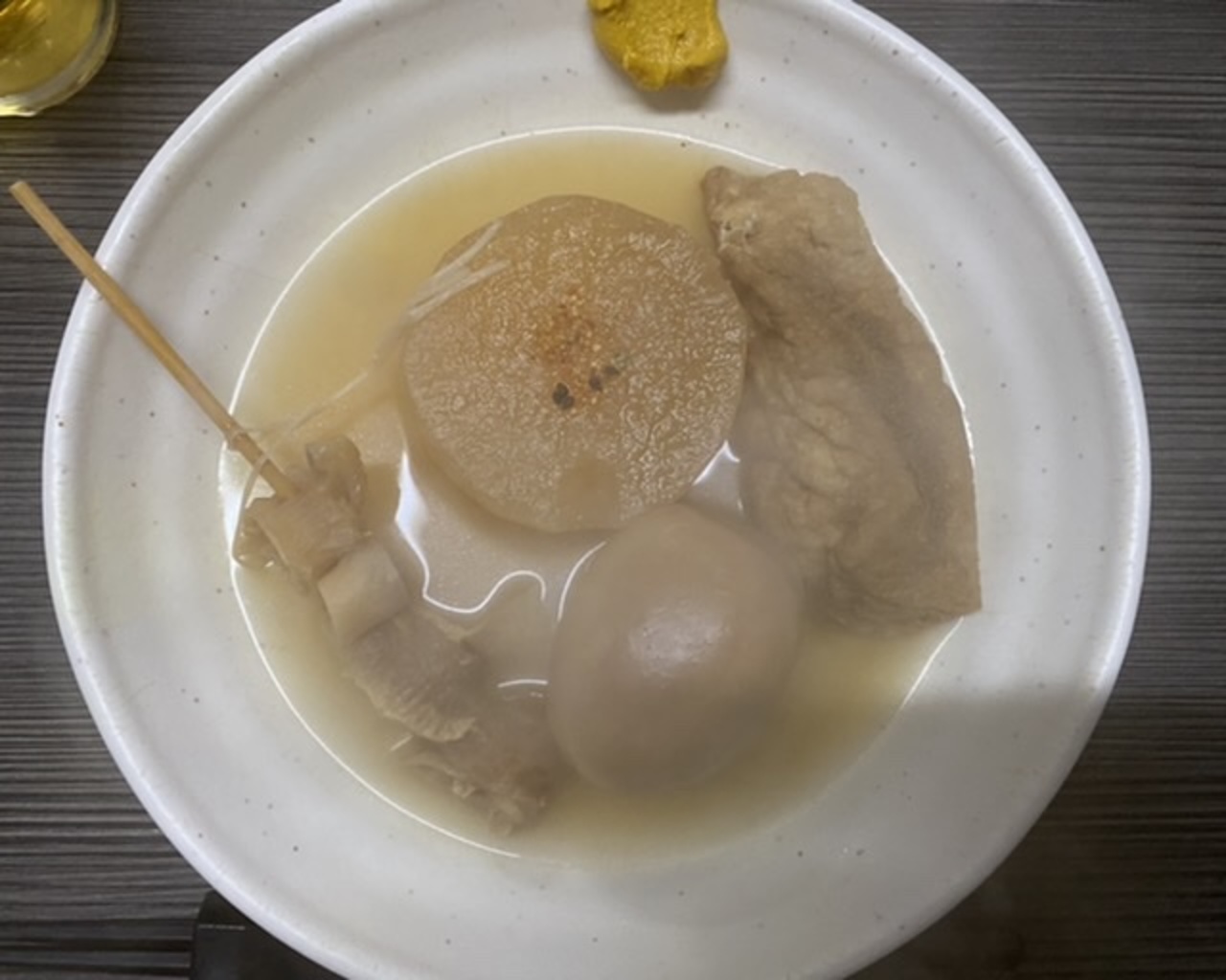 私には、少し濃いめのお出汁でしたが、具材が本当に美味しかったです。大根、玉子、揚げなどの定番のほか、ネギ袋、チーズロールキャベツ、牡蠣などが初めてで最高でした。メニューに値段の記載はありませんが、安かったです。いつも行列ができています。