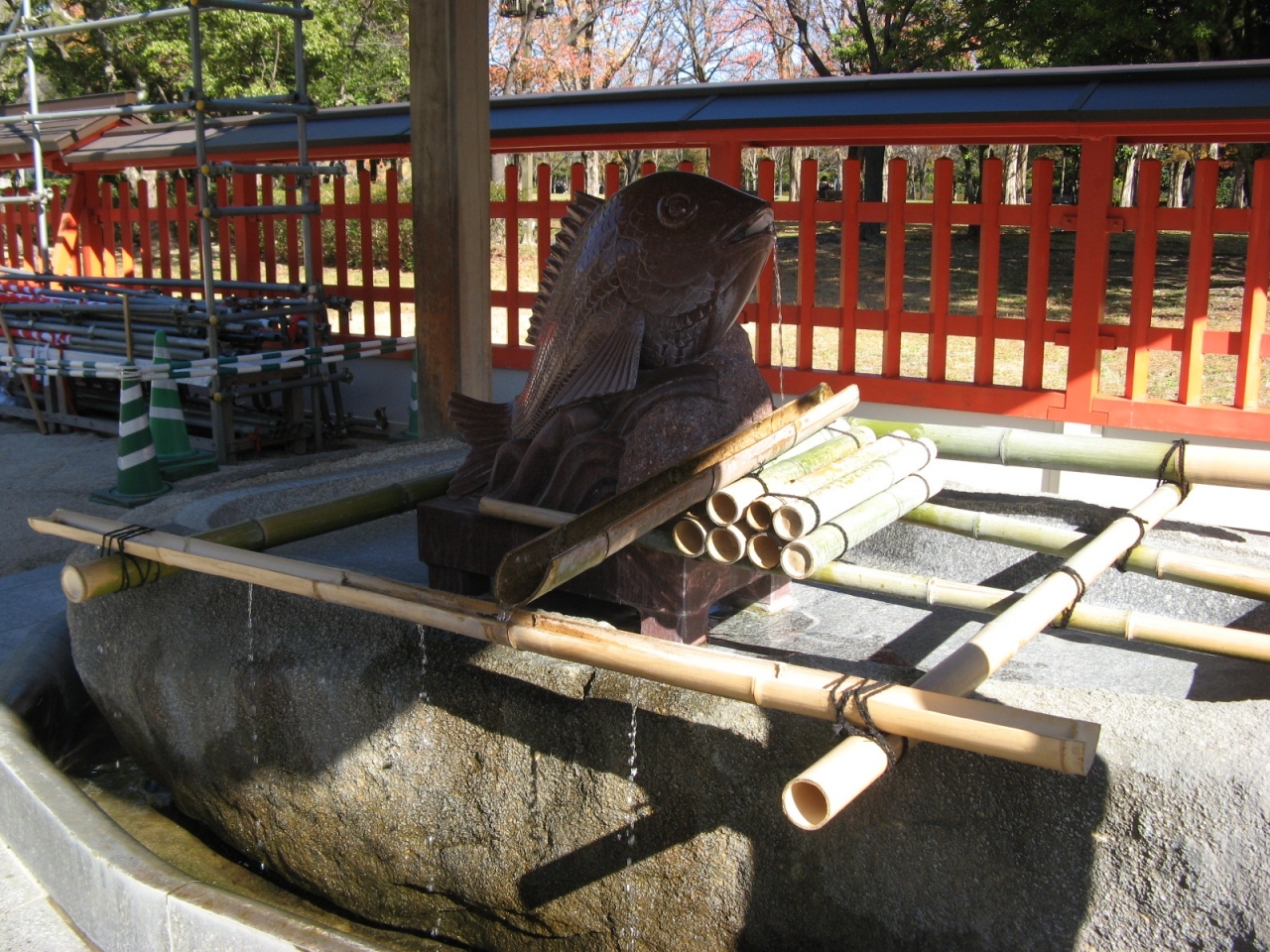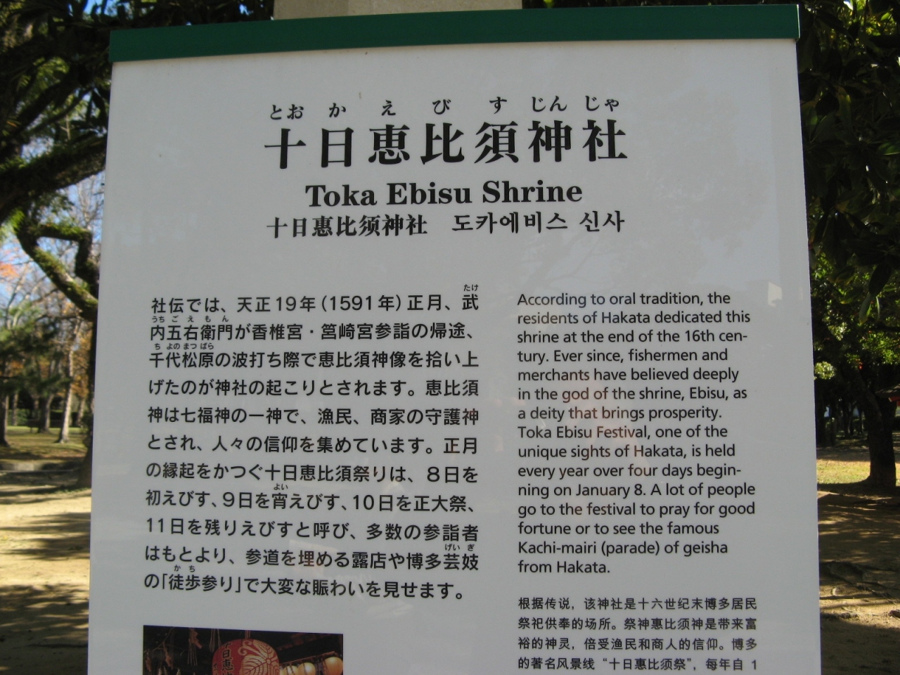 現地にあった説明板(添付写真)によると、1591年に武内五右衛門が香椎宮・筥崎宮の帰途、千代松原の波打ち際で恵比須神像を拾いあげたのが神社の始まりとか。手水舎は鯛の口から水が出ていてお目出度くとても珍しいと思いました。