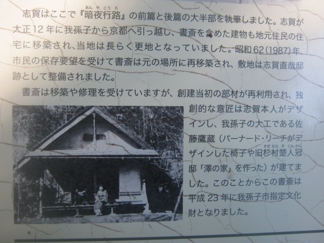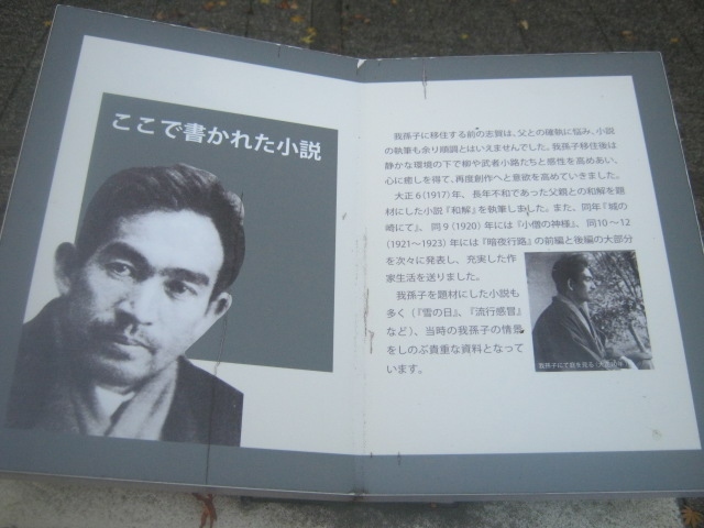 著名人の邸宅跡、というのは、得てして解説板だけが設置されていておしまい、なんて場所も多いので、正直期待せずにここも訪れてみましたが、ここはきちんと建物が残されていて(書斎)、周囲も小公園として整備されていて、ちょっとした休憩スポっとしてもお勧めできるところです。氏は我孫子で、誰もがご存じの「城の崎にて」「和解」「小僧の神様」「暗夜行路」といった代表作を執筆されたとのことで、時間があれば、園内のベンチに座って、これらの小説を読みながら過ごす、なんてのも素敵かなと思います。
