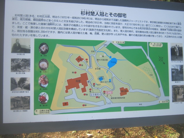 ジャーナリスト杉村楚人冠(本名は廣太郎)を顕彰する記念館ですが、ここは邸宅跡の側面もあり、記念館の建物の周囲も”邸園”として整備されていて、園内を周遊するだけでもかなりの見応えがありました。中でも、かつては現在の楚人冠公園内の高台の景色が良い場所に建っていたという「澤の家」と呼ばれる別荘などが移築されていて、その復元作業などを如実に示した解説板なども非常に勉強になりました。また園内の植物に関してもプレートなどが付されていて、ちょっとした植物園的テイストで散策するのも楽しいところかなと思います。