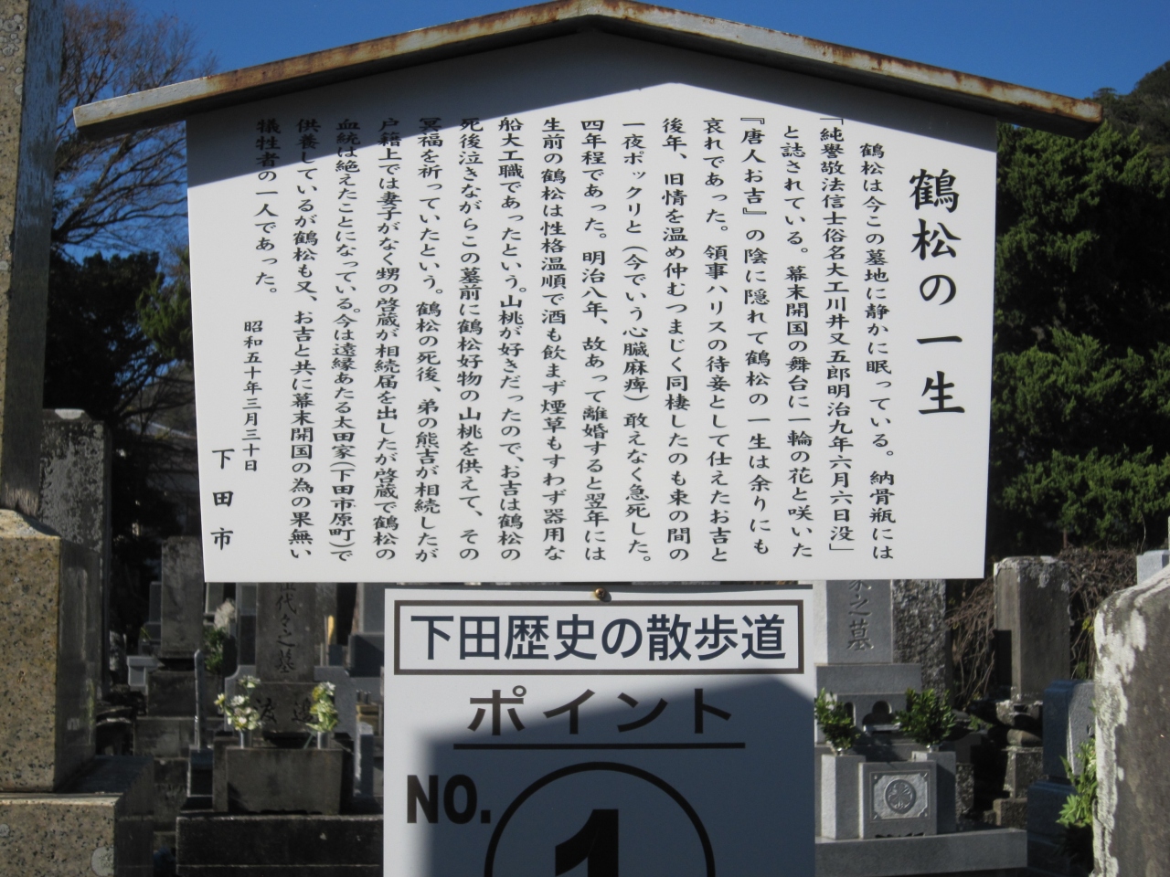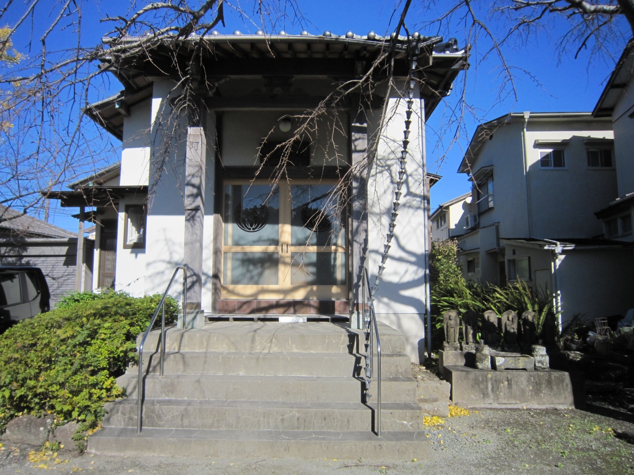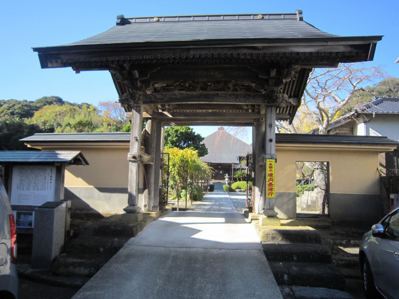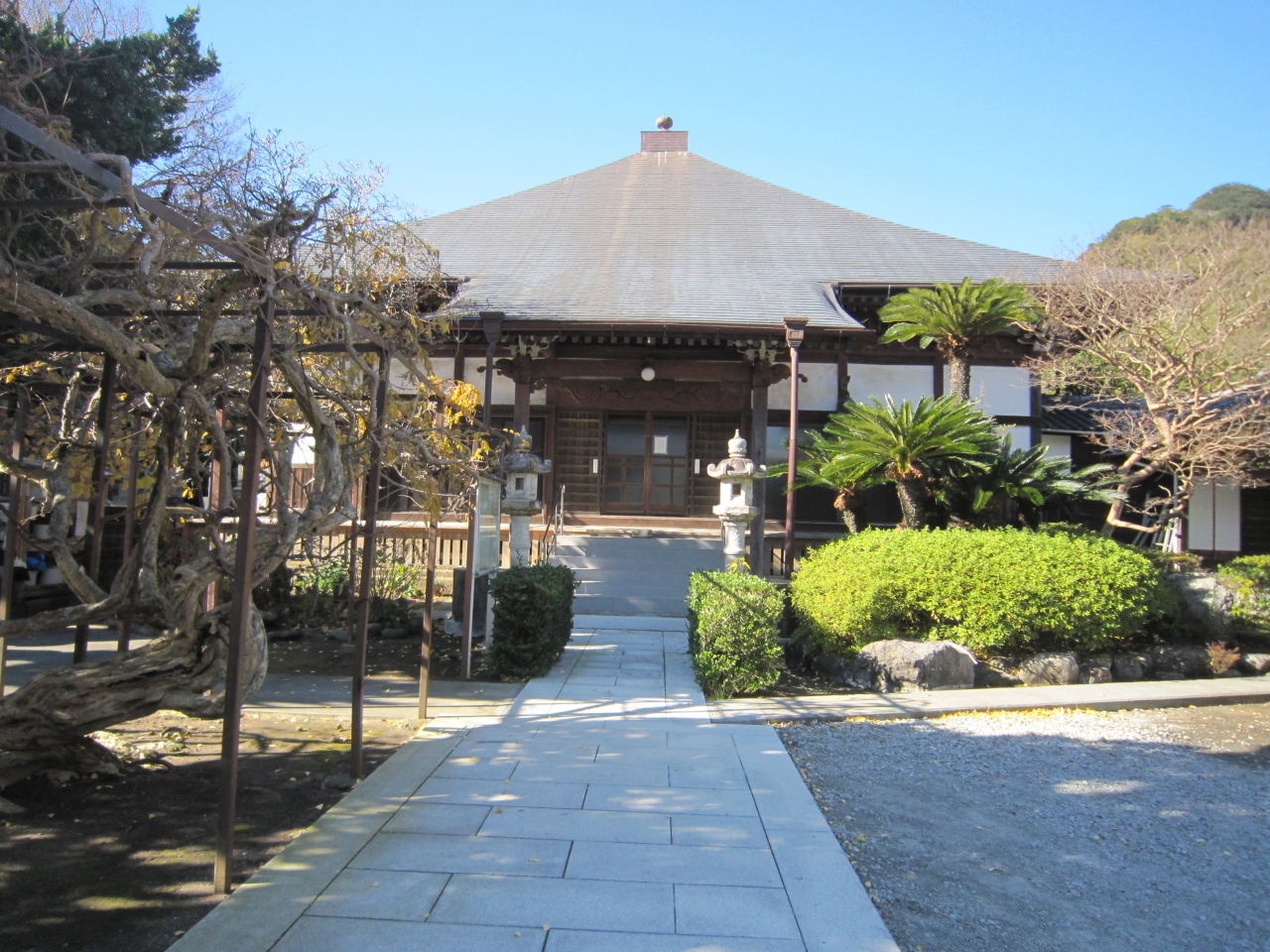 伊豆急下田駅からマイマイ通りを100m位行くと右側奥にあります。ブロック門柱に寺名があり100m位奥にあります。参道の途中右側は民家がありその先に山門、奥に本堂です。山門先右側には阿弥陀堂・西向院があり大きな阿弥陀如来坐像(平安後期)と両側に菩薩像を窓越しに見えました。また、山門の左側5m先にお吉の夫のお墓、本堂左手前には津なみ塚がありました。歴史物が多くあるお寺です。なお、寺名は英語の説明板にToden Templeとありました。寺名の読み方は「とうでんじ」のようです。
