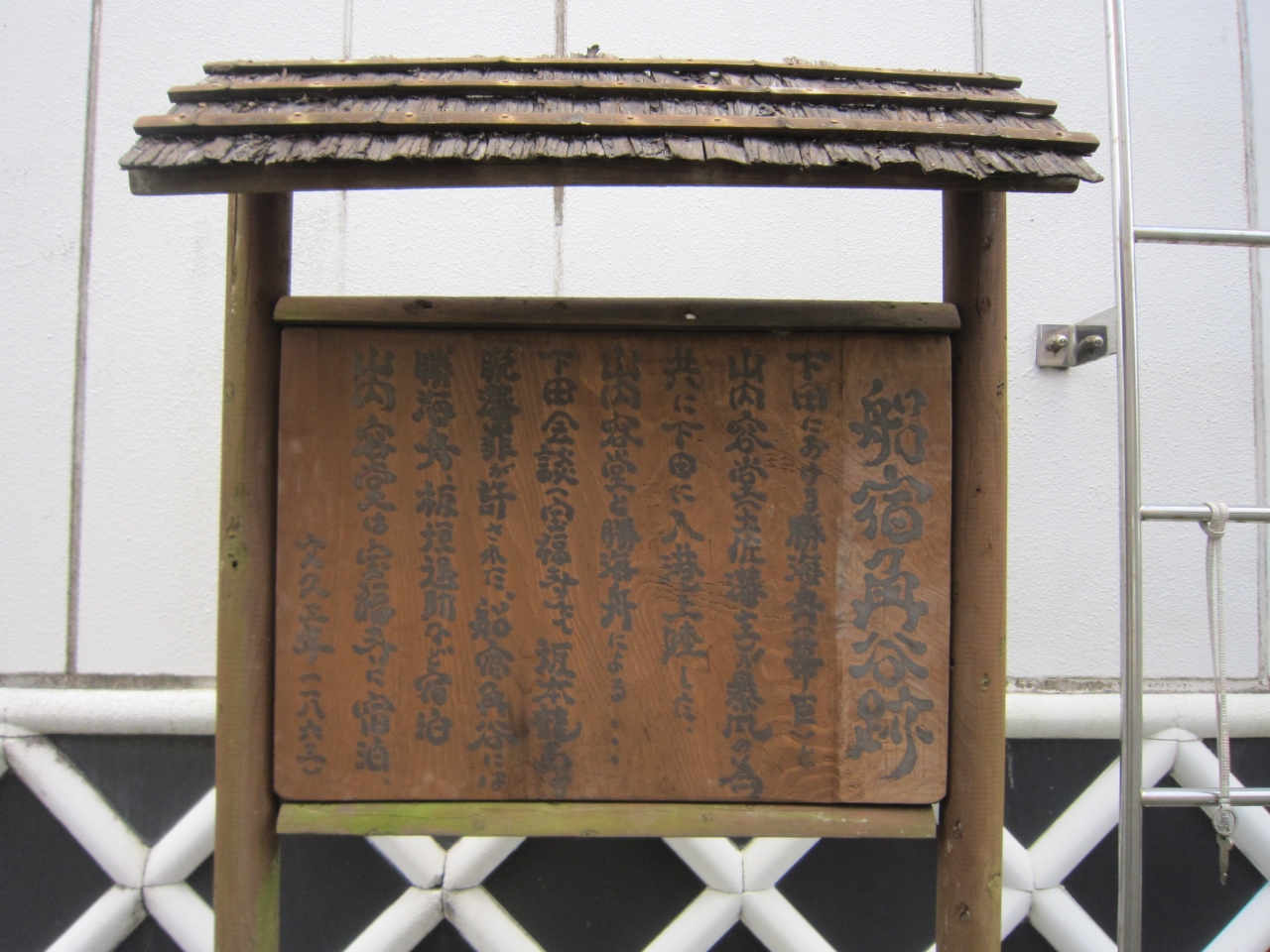 勝海舟が宿泊した船宿、下田の市街地の銀行の筋向い、4階建て建物の横に説明板のみあります。案内板には勝海舟や山内容堂、坂本龍馬、板垣退助の名前があり教科書で開国・幕末に活躍したゆかりの人々が出て来て興味のある説明板でした。