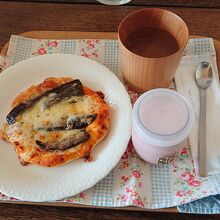 10月上旬のお昼の12時頃に訪問しました。店内はお客さんが次々と来店し、大変な賑わいぶりでした。パン他数点を購入し、一部をテイクアウト、一部をイートインしました。そのうち、「季節のやさいピザ」は、たっぷり用いられたナスとチーズの相性が良く、おいしくいただけました。