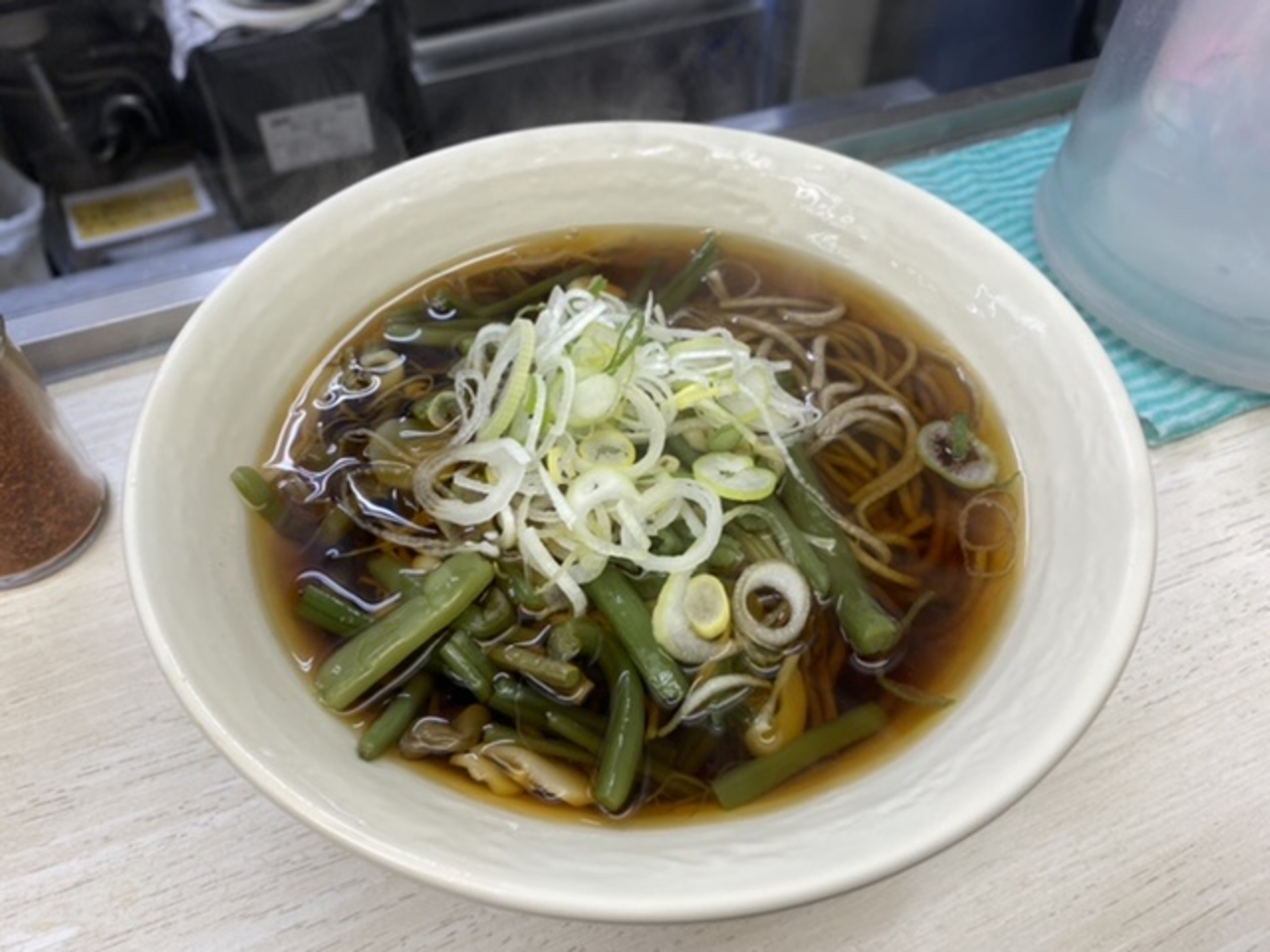 JR品川駅構内の横須賀線ホームにある駅蕎麦屋さんです。平日の朝に利用しました。カレーライスか蕎麦にするか、まよいましたが蕎麦にしました。ヘルシーに山菜蕎麦460円!山菜がたくさんのっていてイイですね。山菜好きなので。
