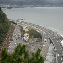 鉄道と道路が狭い敷地にひしめきあっているビジュアルが見たくて薩埵峠にのぼりました。鉄道より後から敷かれた東名高速道路が敷地がなくて海に張り出しているビジュアルがいいですね。車で走っているとわからないけれど、橋脚を波が洗っているのですね。