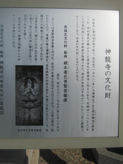 土浦城跡のある亀城公園の北側にあるお寺で、土浦城跡からは徒歩5分位の近距離ですが、途中、交通量の激しい道路を渡らなくてはならないので、信号まで迂回するともう少し時間がかかります。このお寺には天井画や普賢菩薩像など、市の指定文化財になっている寺宝があるようで、本堂前の解説板に誇らしげに記されていましたが、残念ながら普段は非公開とのことでした。
