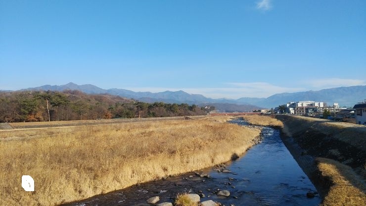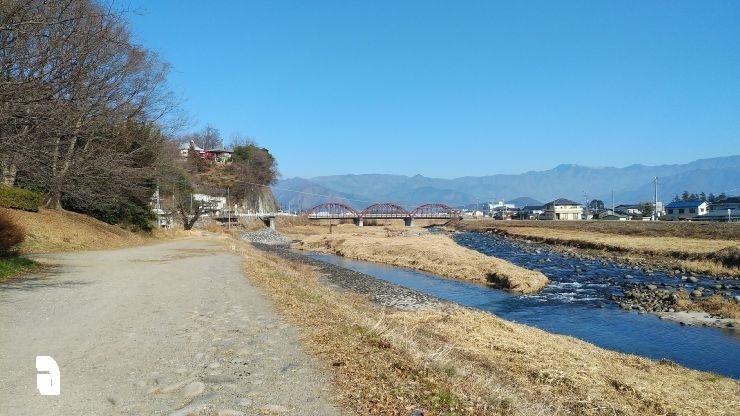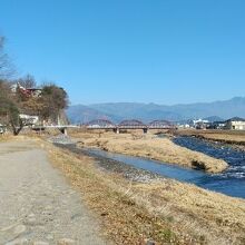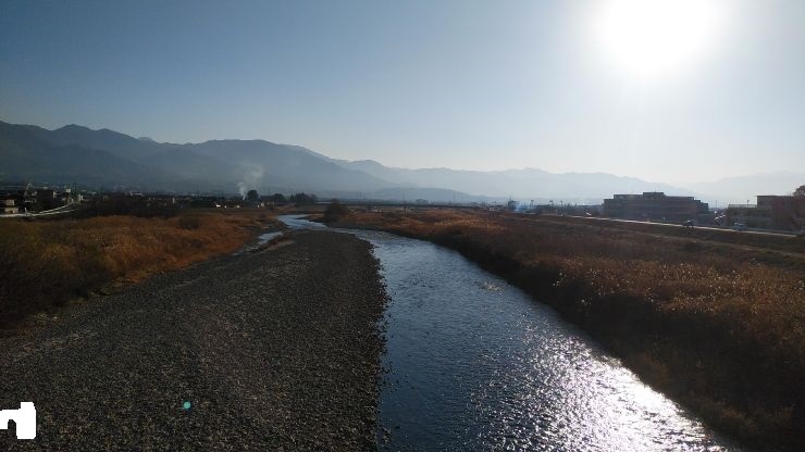 笛吹川は甲府盆地を流れる全長46.5キロの一級河川。山梨市駅から3分の場所にあった。石和温泉周辺を観光しているときも南側の地域を流れる河川として横切った。冬の時期で天気も安定しているためか、水量も安定しており流れも穏やかな河川だった。