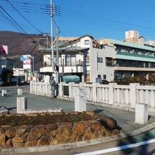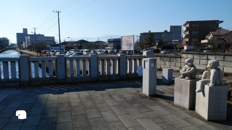 石和温泉駅から徒歩5分ほど、平等川にかかる橋。カッパの像と笛吹権三郎の像がそれぞれの歩道に設置されており、観光地らしい雰囲気が漂う。自動車の通行量も多く、駅からの近さもあり人通りも多い場所だった。