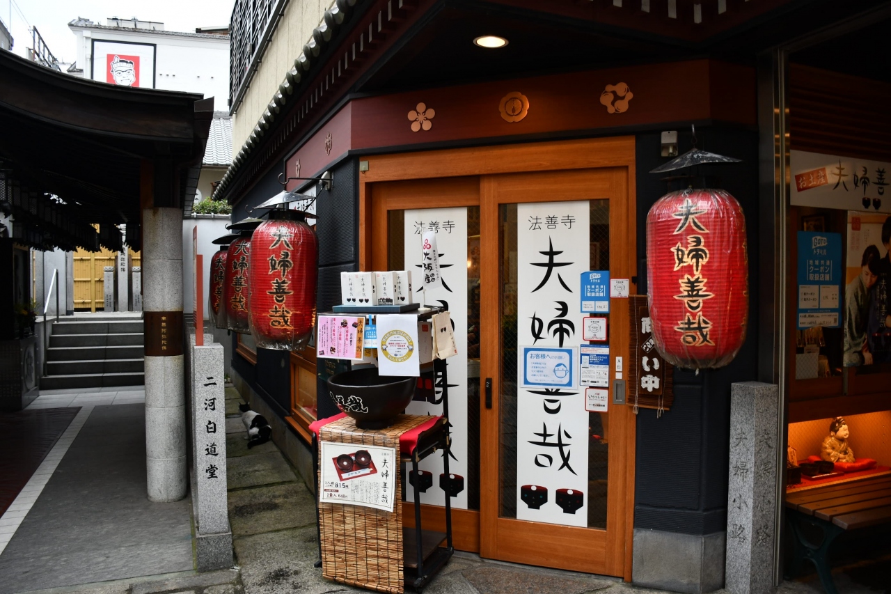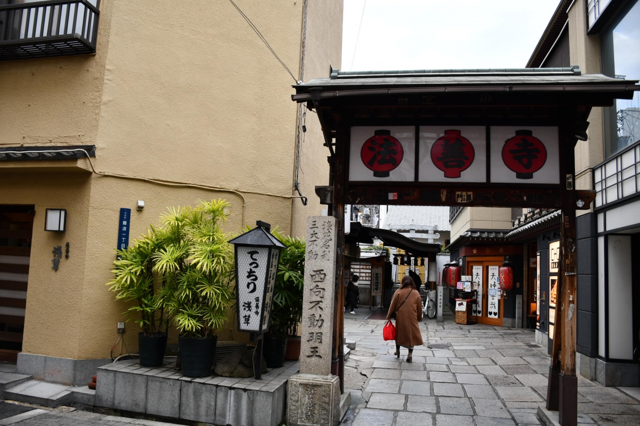 道頓堀から一筋南に入ると、細い路地が通っており、お堂があります。法善寺様、通り名が水掛け不動さんです。名代の夫婦善哉もお隣にお店を構えておられます。この一帯を「法善寺横丁」と呼んで、藤山寛美さん筆の額が架けられていますが、大坂では「横町、よこまち」でした。