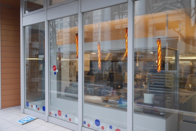 テイクアウトでの利用。自分はあまり甘いものを好まないので、家族におみやげに買って帰りました。烏丸界隈をぶらりしていたら、なにやら気になるお店…というかライトが。フランスパンのライトが、天井からぶら下がっている…?!とてもユニークです。半地下のお店もおしゃれですね。