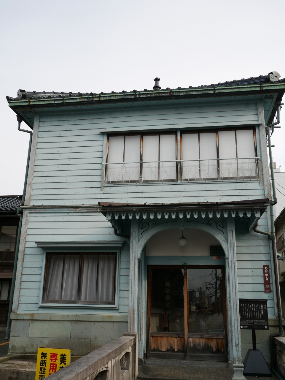 芸者さんの稽古場や管理事務所と建てられたとのことですが、派手やかな芸者さんのイメージとは違って、やや小さめの、2階建の地味目の感じの建物です。~うすい水色みたいな色もなんだか茶屋街とはマッチしていないような・・。
