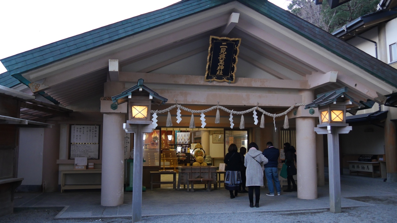 JR二見浦駅から参道を通って歩いて20分ほど。