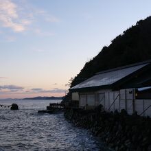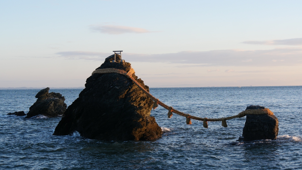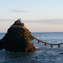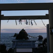 二見浦のシンボル、夫婦岩の前に海岸の岩にへばりついたような社殿があります。