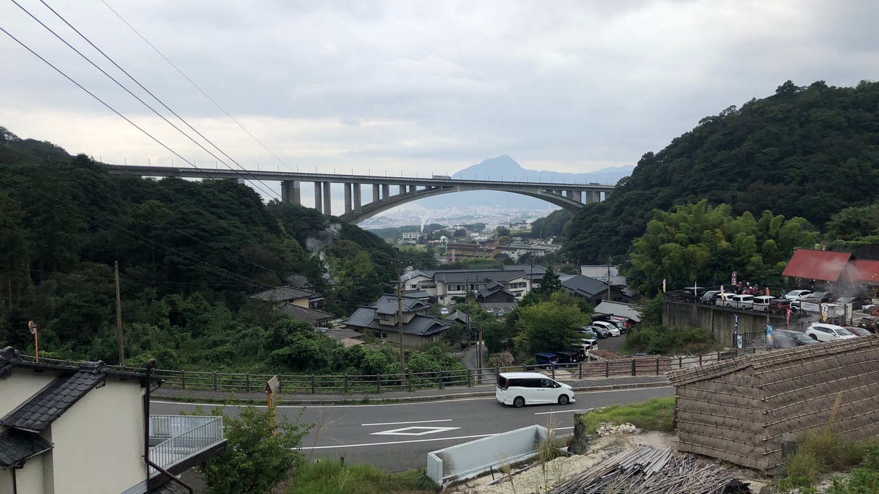 東九州自動車道のアーチ橋です。そんなに長くありませんが、山と山をつなぐような高い場所にあります。「明礬(みょうばん)」とは、橋の近くにある温泉の名前です。明礬温泉エリアからは、別府明礬橋が見え、アーチの間からは別府湾も見えます。