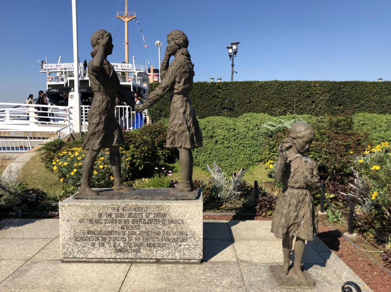 ちょうど中央付近の氷川丸の近くにある向かい合う少女の像が「ガールスカウトの像」。