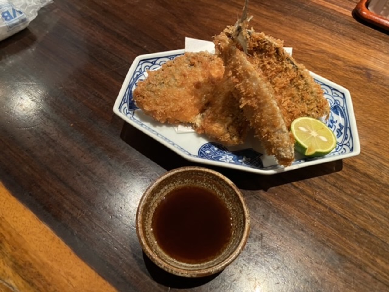 豚肉の柚子胡椒塩麹漬焼き、刺身5点盛り、アジフライ!最後はコップ酒で〆ましたよ。