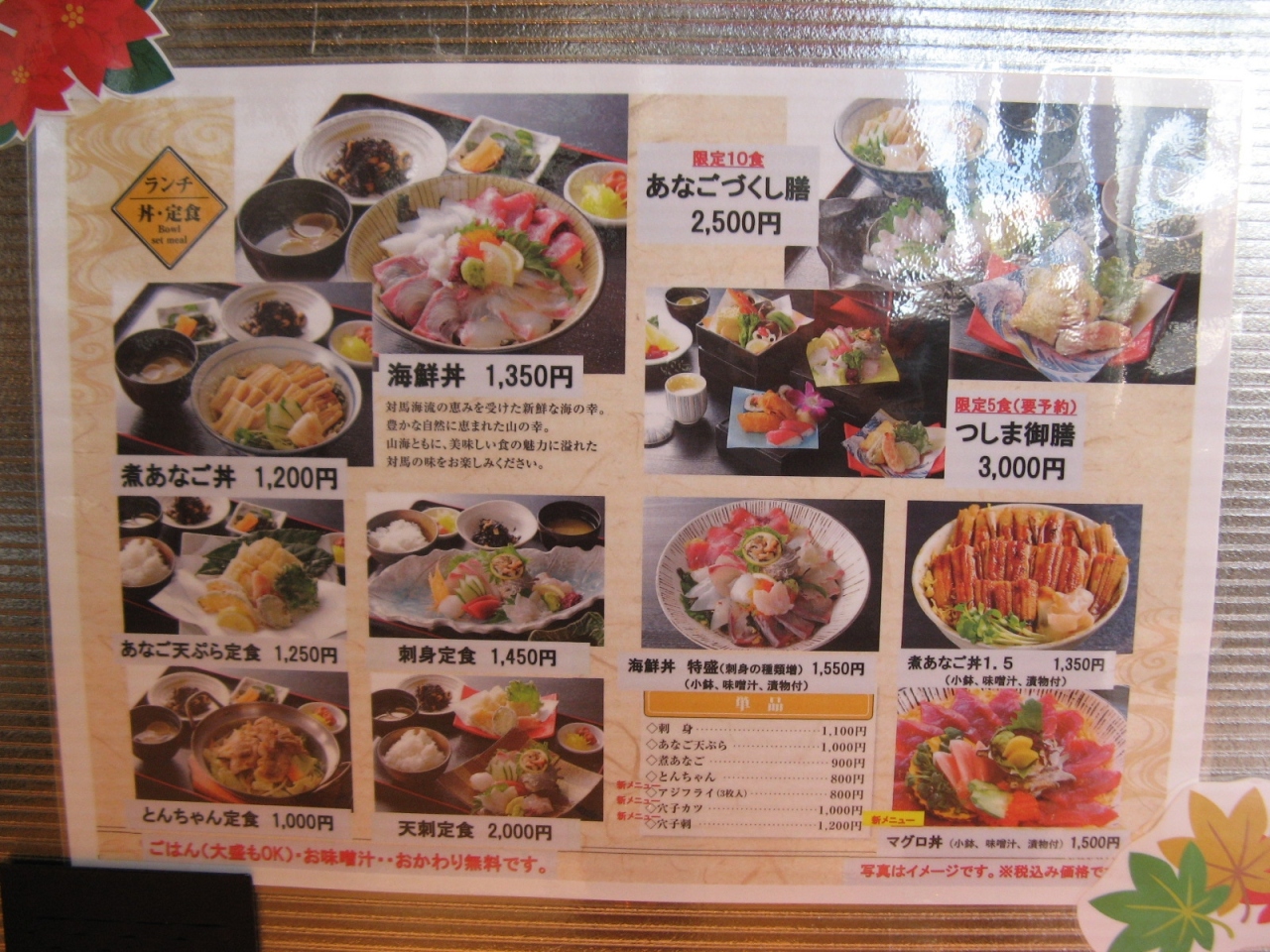 一階が対馬の名産品等を扱うアンテナショップで、2階がお食事処になっています。水槽には穴子がいっぱい泳いでいました。お店自体はそんなに広くはないですが、テーブル席や座敷もあります。頂いたのは“煮あなご丼1.5 1350円”で小鉢、香の物、お味噌汁が付いてました。煮あなご丼は小皿で穴子が増量(通常の煮あなご丼は1200円)されていて、穴子はふわふわ、小鉢のひじきの煮つけのひじきは太くてとても美味しくて大満足しました。なお、お味噌汁とご飯のおかわりは無料です。