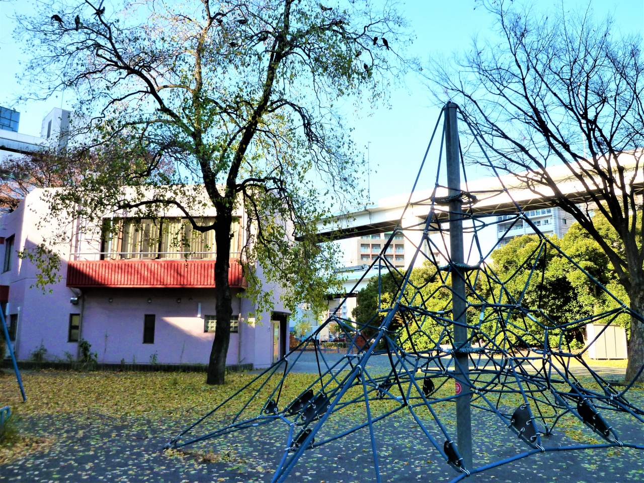 `神奈川`の由来は現・横浜市神奈川区の宿場町神奈川宿/京急本線京急東神奈川駅の近くに流れていた長さ300メートルほどの小川(神奈河/神名川/上無川)が発端で、<神奈川公園>は神奈川区で昔からの踏襲してますね(`現-神奈川県`を表わすなら横浜/川崎/相模原//どこでも可能です)。中くらい公園です…ブランコ/東屋風階段/鉄線の輪枠繰り//が園の中に、ふと見ると湾岸線首都高が林/建屋の近くに☆