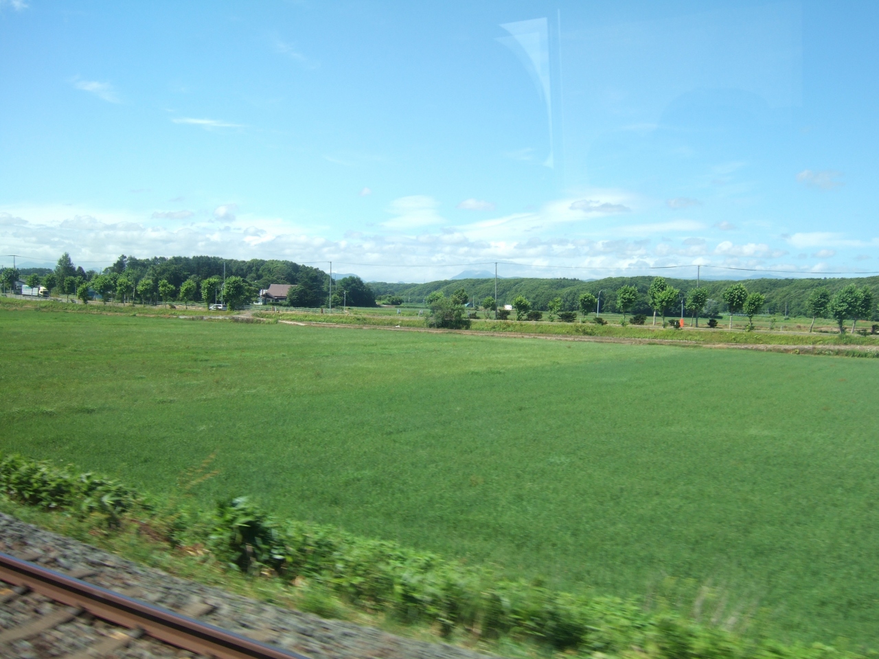 札幌から特急に乗って苫小牧を過ぎると左手には海が広がり、右手には畑の向こうにいろいろな山が見えるので、どちらに座席を取るか迷います。