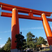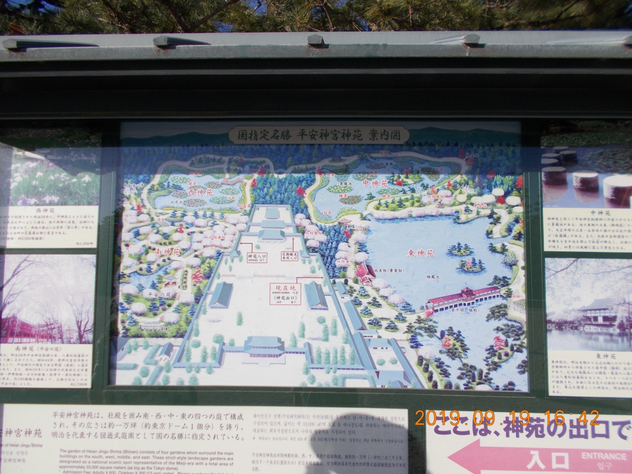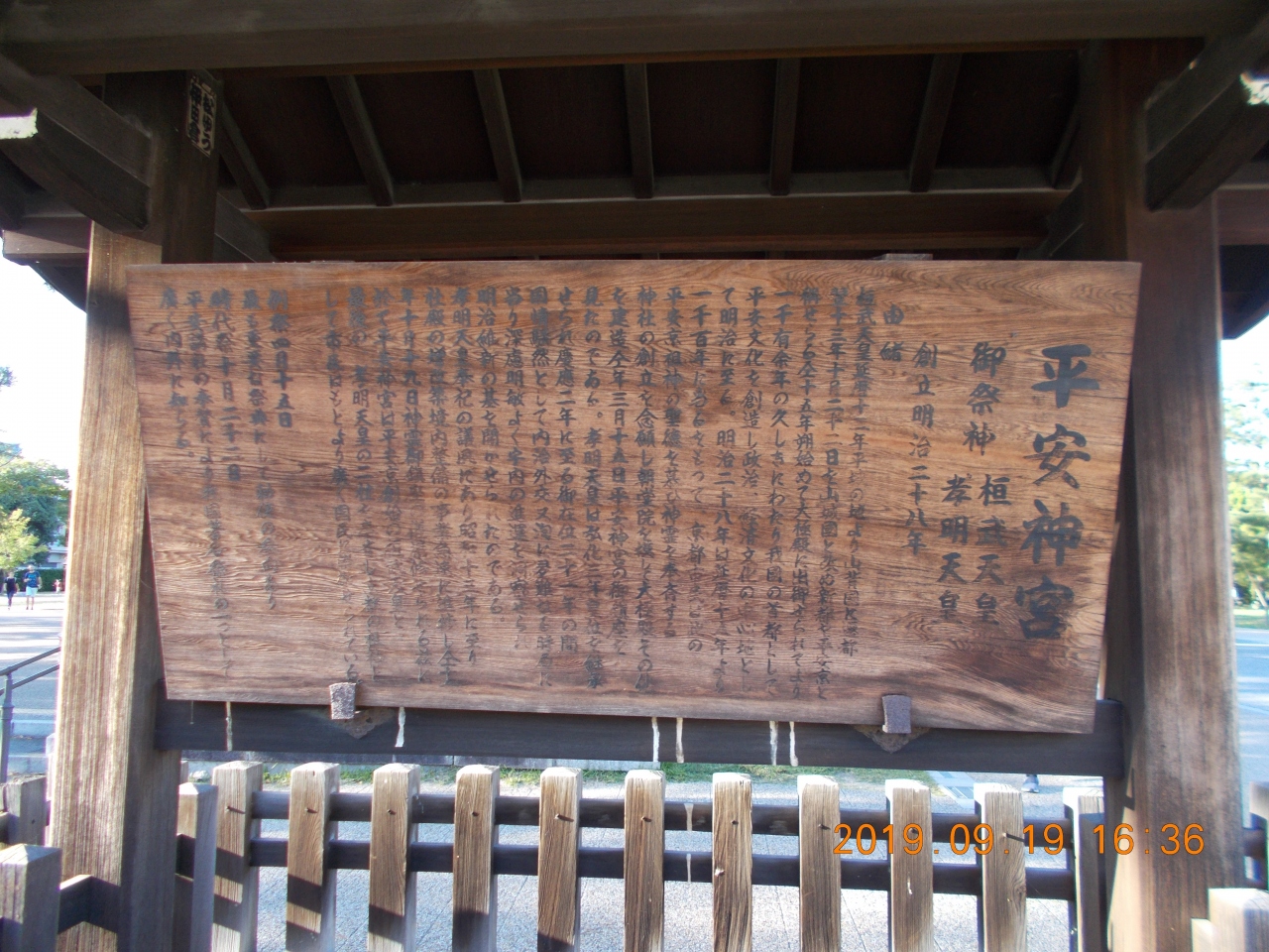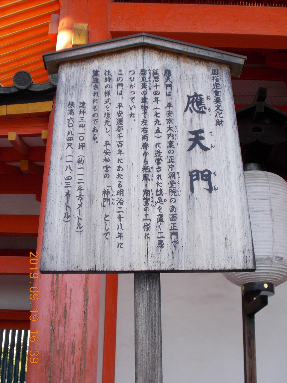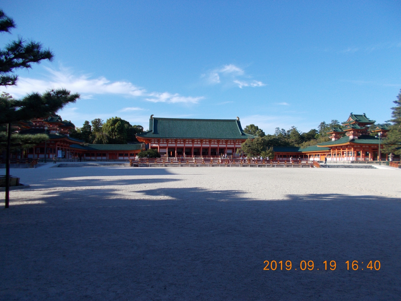 京都駅からバスで向かう。バス停を下りると大きな神社が聳え立っている。神宮へ進むと応天門が建ち、さらに進むと本殿がある。神苑拝観が通常は有料であるが、9/19は無料で拝観できるとあった。しかし、到着時は既に受付終了の時間であったので、境内を見学した。