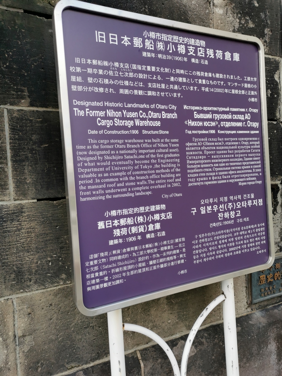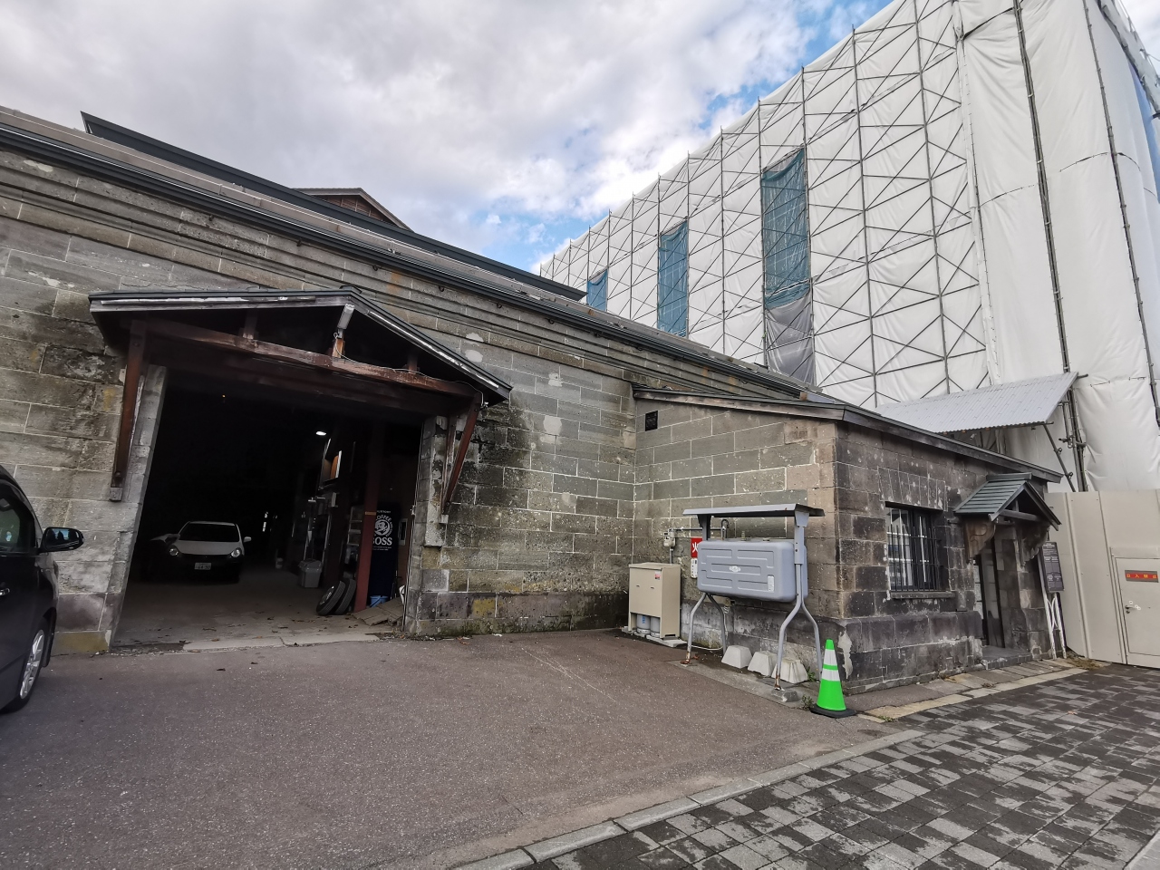 北海道一人旅。札幌と小樽を散歩旅です。JRで小樽に移動。小樽駅を降りて小樽運河観光や明治~昭和初期の旧い建物探訪をしました。観光の足は駅近くで電動レンタルサイクルを借りました。浅草橋から小樽運河を北運河方向へ。小樽運河公園は北運河の北端にある公園です。運河公園の道向こうに「旧日本郵船 小樽支店」があります。ちょうど改修工事中でした。横の建物が「残荷倉庫」ですね。こちらも改修工事の資材置き場となっていましたが建物は見る事ができました。この建物は小樽指定歴史的建造物となっています。明治39年に建築。石造の建物です。