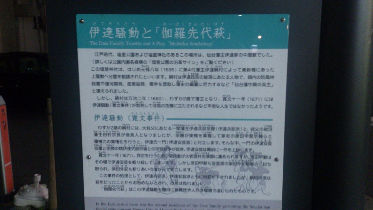港区新橋5丁目にある塩竈公園に説明板が立っています。伊達騒動とは仙台藩3代藩主の伊達綱宗の放蕩が原因で強制隠居させられ、わずか2歳の伊達綱村が4代藩主となったお家騒動。この伊達騒動を題材とした人形浄瑠璃や歌舞伎の演目が【伽蘿先代萩】だそうです。説明文を読んでも全体像は良くわからず、塩竈公園と伽蘿先代萩の関係は私の中では不明のままです。