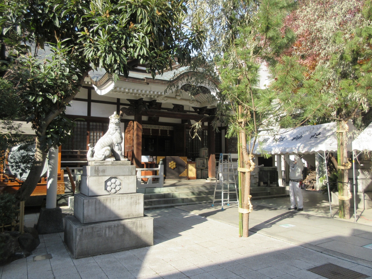 都営浅草線・蔵前駅から7分ほどのところに建つ、創建651年の古社です。重さ4tほどと言われる千貫御輿を担いでの鳥越祭りで知られています。敷地はそれほど広くありませんが、拝殿の壁は白く、落ち着きが感じられます。境内には、安産の神を祀る志志岐神社や、菅原道真をはじめ大黒天神や恵比寿神を祀る福寿神社があり、周辺地域の人から篤く信仰されています。年末に訪れた時は、地元の役員さんたちがテントを張ったり、お神酒の準備をしたり、拝殿前に門松を設置したりと正月の準備を忙しそうに行っていました。参拝者はわずかしかいませんでしたが、正月はとても混み合うことと思います。