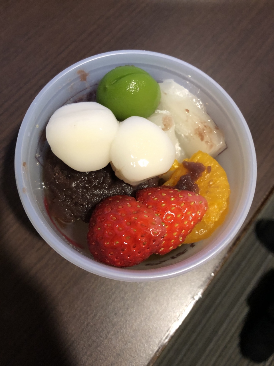 店内飲食は少し行列ができていたので、あんみつクリスマスバージョンと白玉金時をお持ち帰りしました。あんみつクリスマスバージョンは赤いイチゴと緑の白玉と思っていたら、緑の丸いのは梅でした。白玉金時は煮小豆というのはちょっと自分にとってもは珍しかったです。両方とも美味しく頂きました。