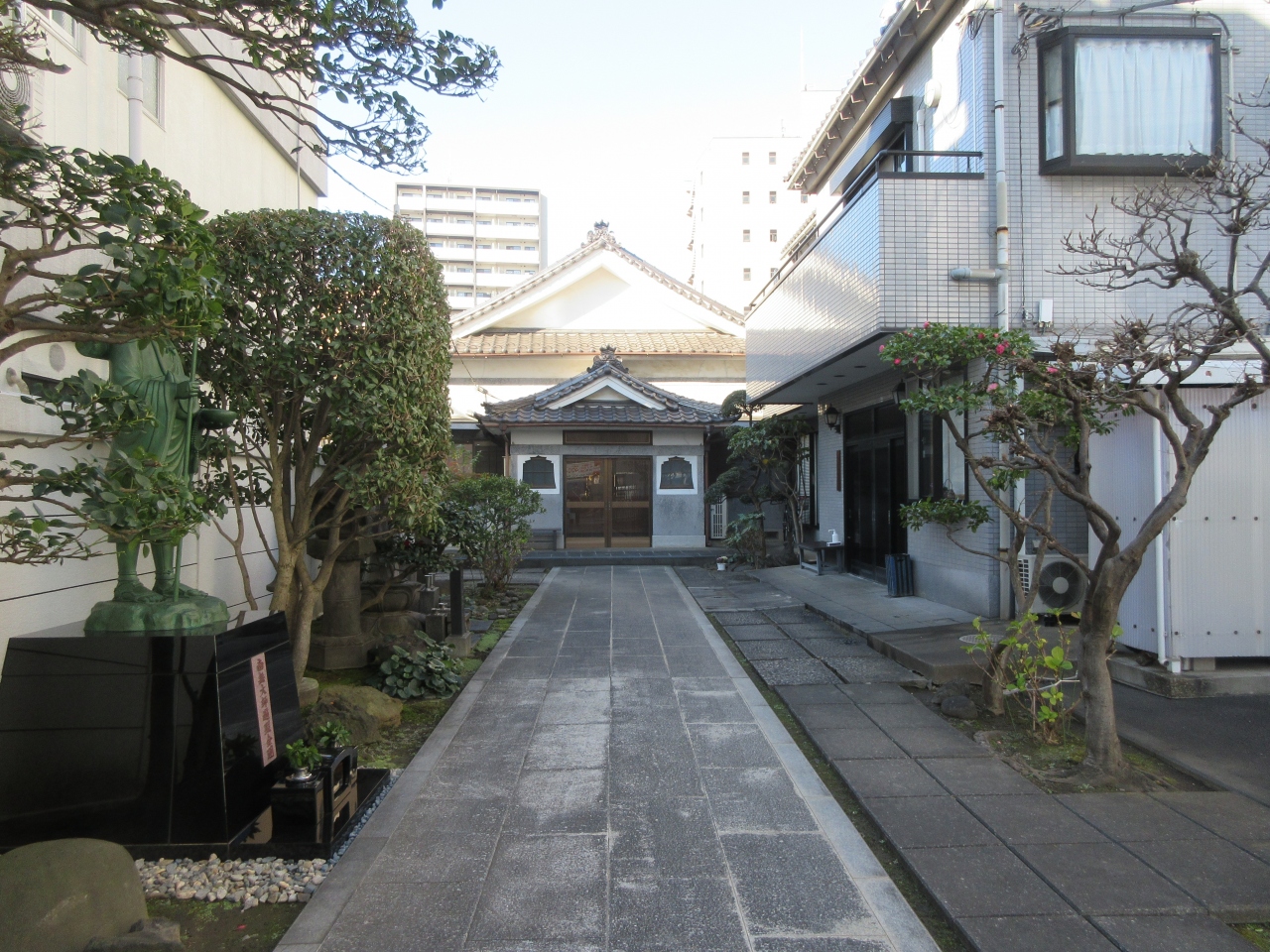 JR上野駅から浅草方向に向かう浅草通り沿いの元浅草、松が谷、西浅草、寿エリアには数多くの寺が点在しています。多くの寺は境内が狭くこじんまりしています。松が谷1丁目交差点から150mほど浅草寄りに建つ、真言宗のこの寺も同様です。本堂は一見すると銭湯のような姿で、山門と本堂の間の10mほどの参道には、数本の木々と白衣観世音菩薩が建っています。観光寺院ではないので特別な見どころはありません。