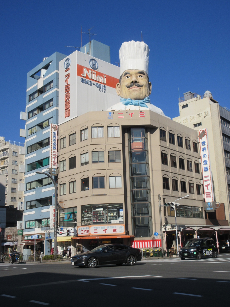 銀座線・田原町駅から3分ほど、JR上野駅から浅草方向に向かう浅草通り沿い、かっぱ橋道具街通り入口に建つ食器の店です。屋上にコックさんの大きな像が飾られています。時間が無く1階しか見て回ることができませんでしたが、業務用の鍋や湯切り具、箸入れ、食器、スプーンなどの他、ビールを入れるピッチャーやワインを入れるデカンタやカラフェ、ワイングラス、ウォーターピッチャーなどが並び、大量購入にも応じてくれるとのことでした。洋食器以外にも竹製のわっぱや木製のお椀、土鍋、IH用土鍋、茶器など和食器も店頭に並んでいました。色々な食器が手に入る店です。
