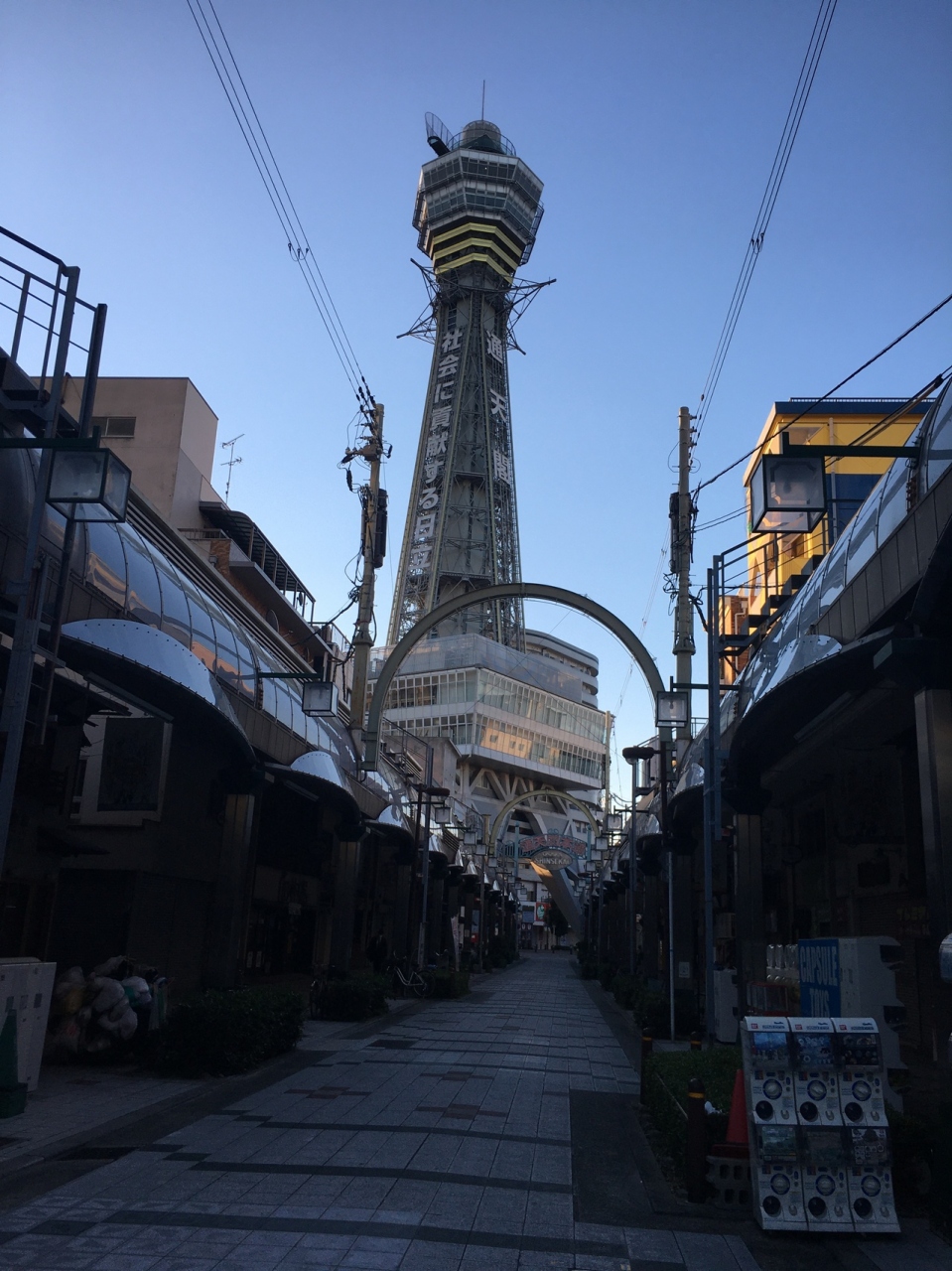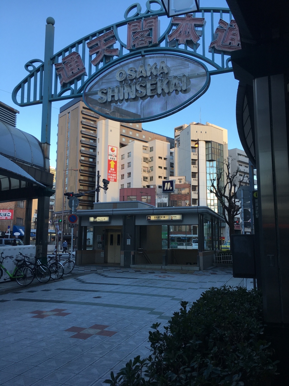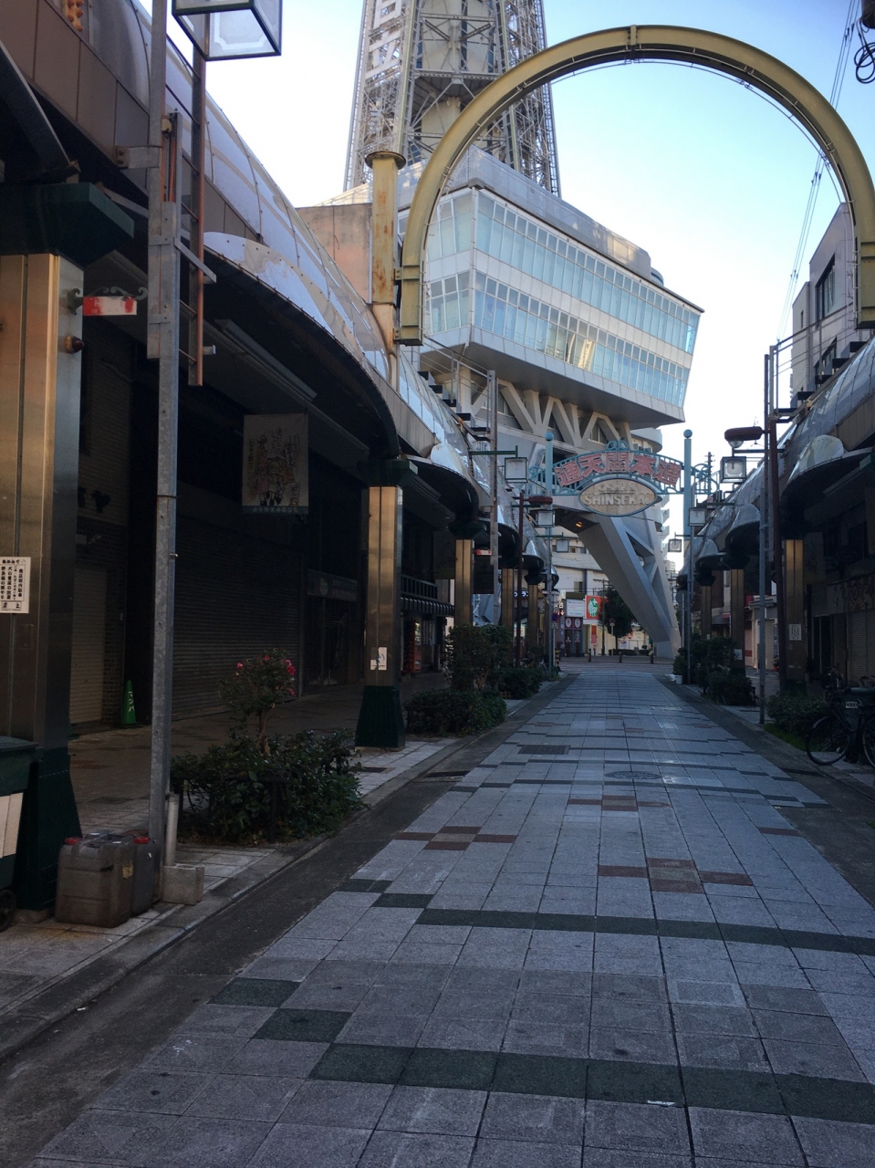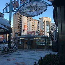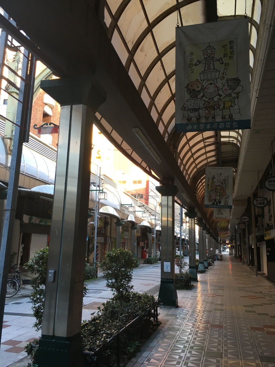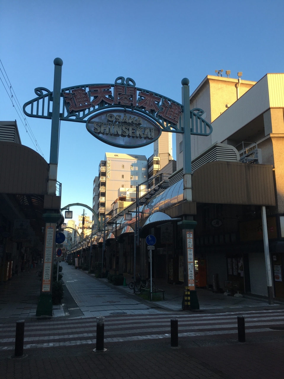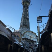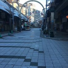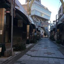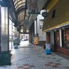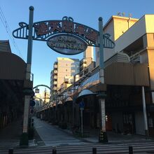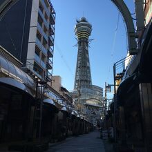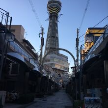地下鉄恵比須町駅の地上出口上にあり、通天閣まで真っ直ぐ続く商店街で地元で密着型というより観光客向けの店が多かったです。道幅が広めのためか人は少ないような感じでした。左右の歩道には屋根があり中央は車道です。